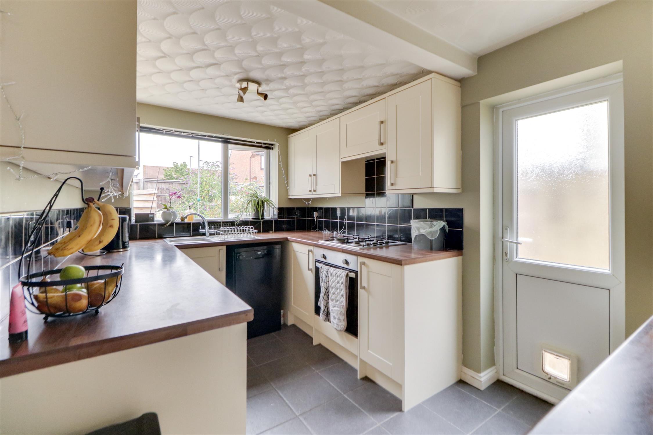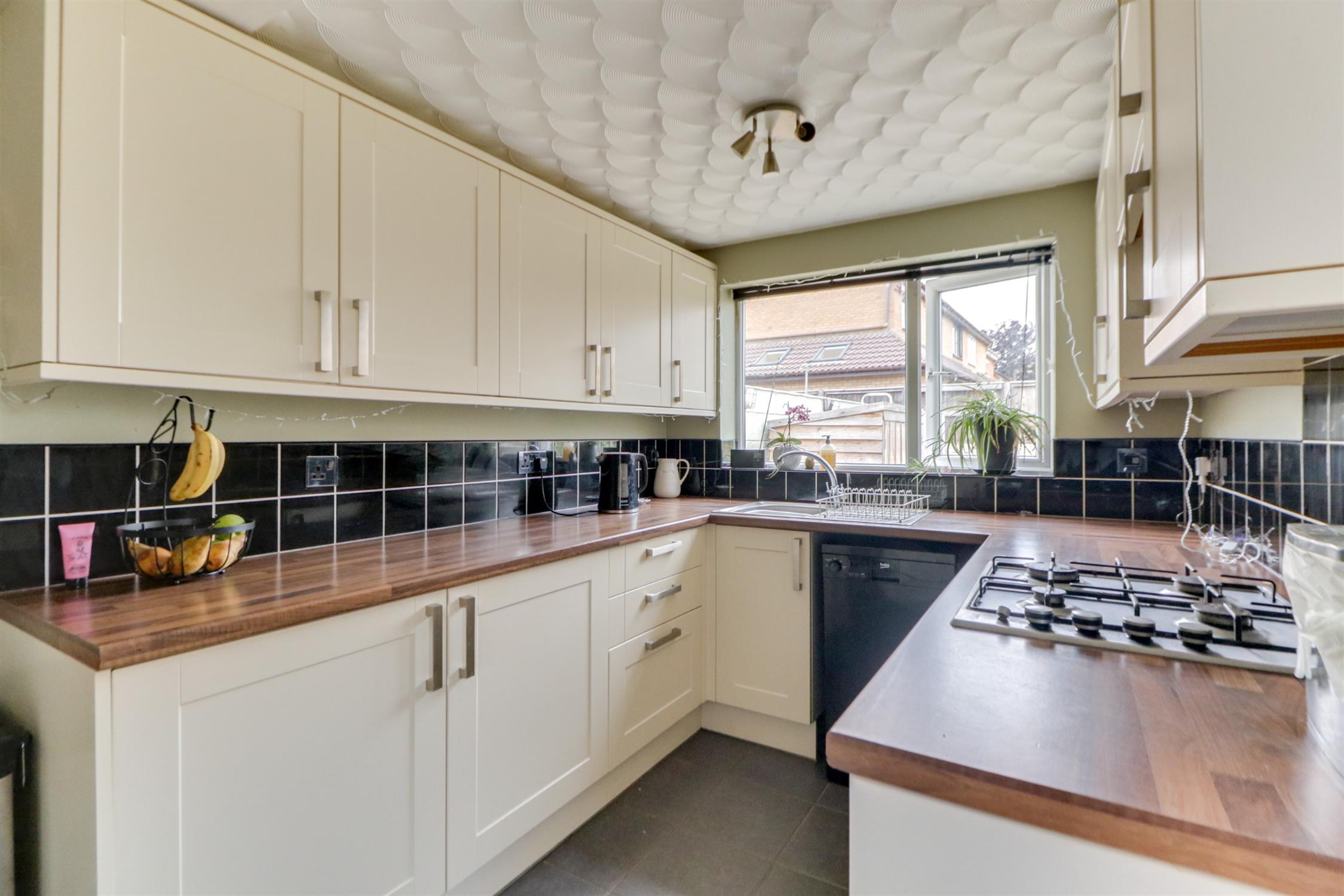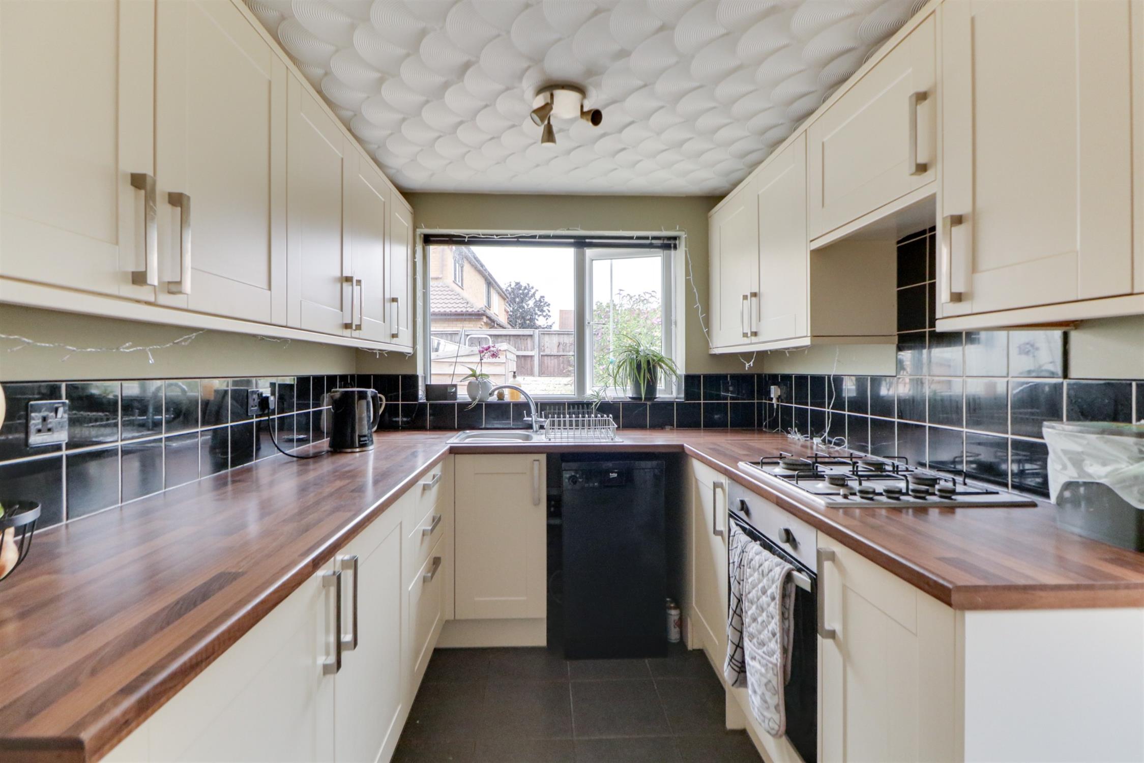 Textured ceiling, double glazed window, double glazed obscured door to rear garden, range of wall and base mounted units with work surfaces over, inset stainless steel sink and drainer with mixer tap over, integrated electric oven and gas hob, integrated under counter fridge freezer, space for washing machine and dishwasher, part tiled walls, tiled floor.