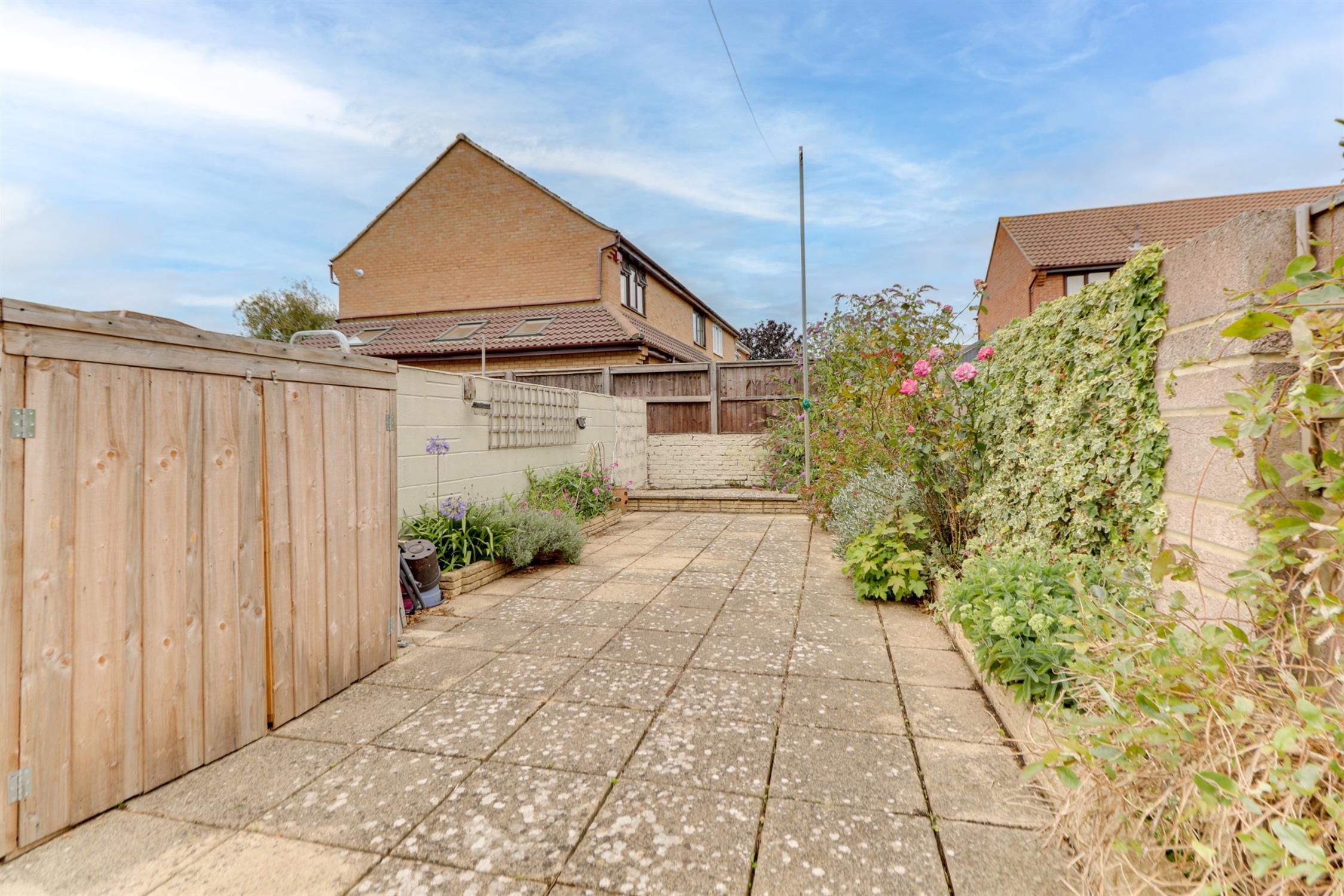 Rear - Wall enclosed garden, mostly laid to patio with mature planting borders, storage shed.