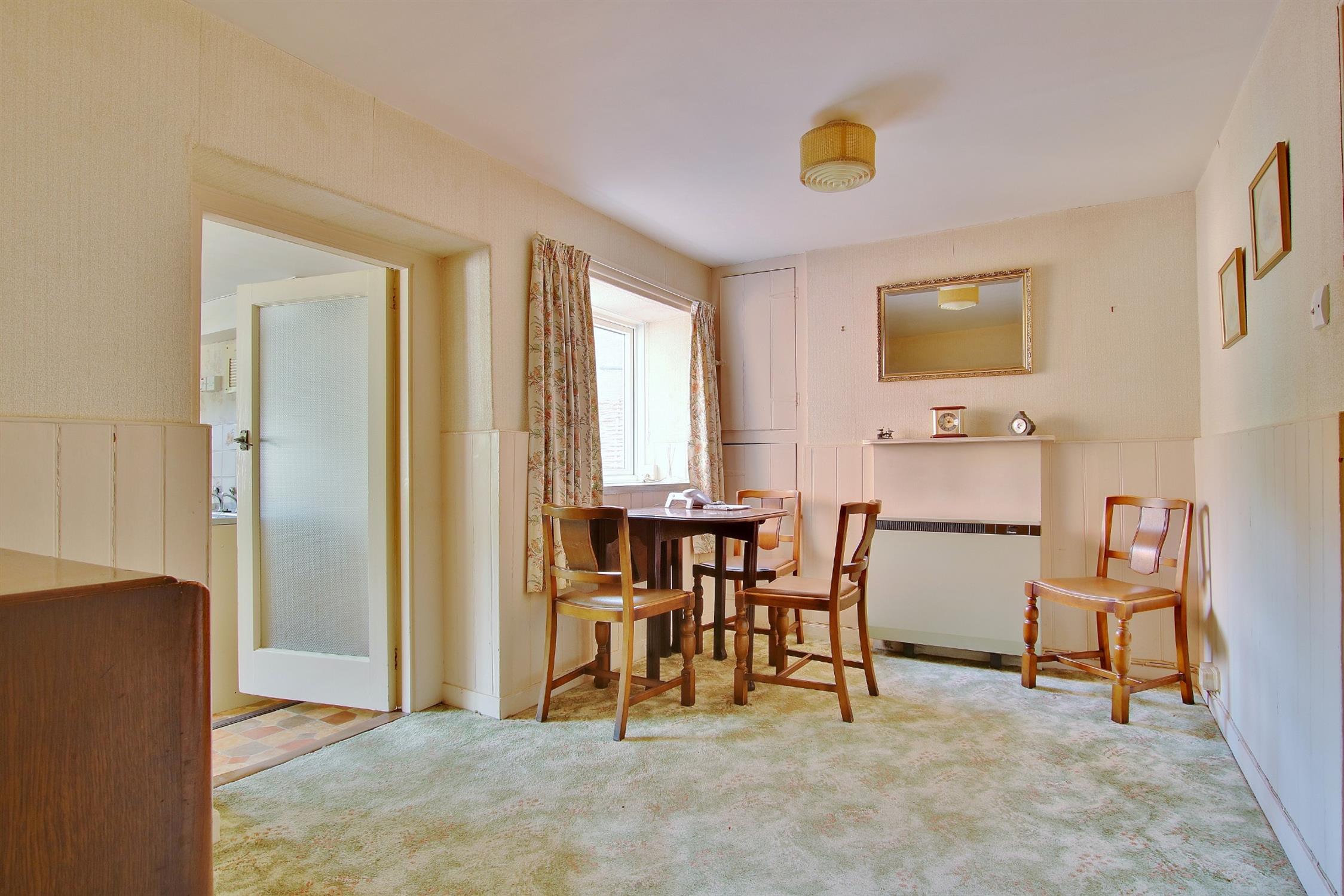 The original main entrance at the front, although not in use currently, leads into the sitting room from which is a concealed staircase to the first floor and a door into the dining room. In turn, a door opens into the kitchen/breakfast room which has a basic but well maintained range of wall and base units, space for cooker and fridge, door to the rear garden, and room to accommodate a table and chairs for informal eating. Adjoining the kitchen is the bathroom which contains a well preserved coloured suite with partial wall tiling and a window to the rear.