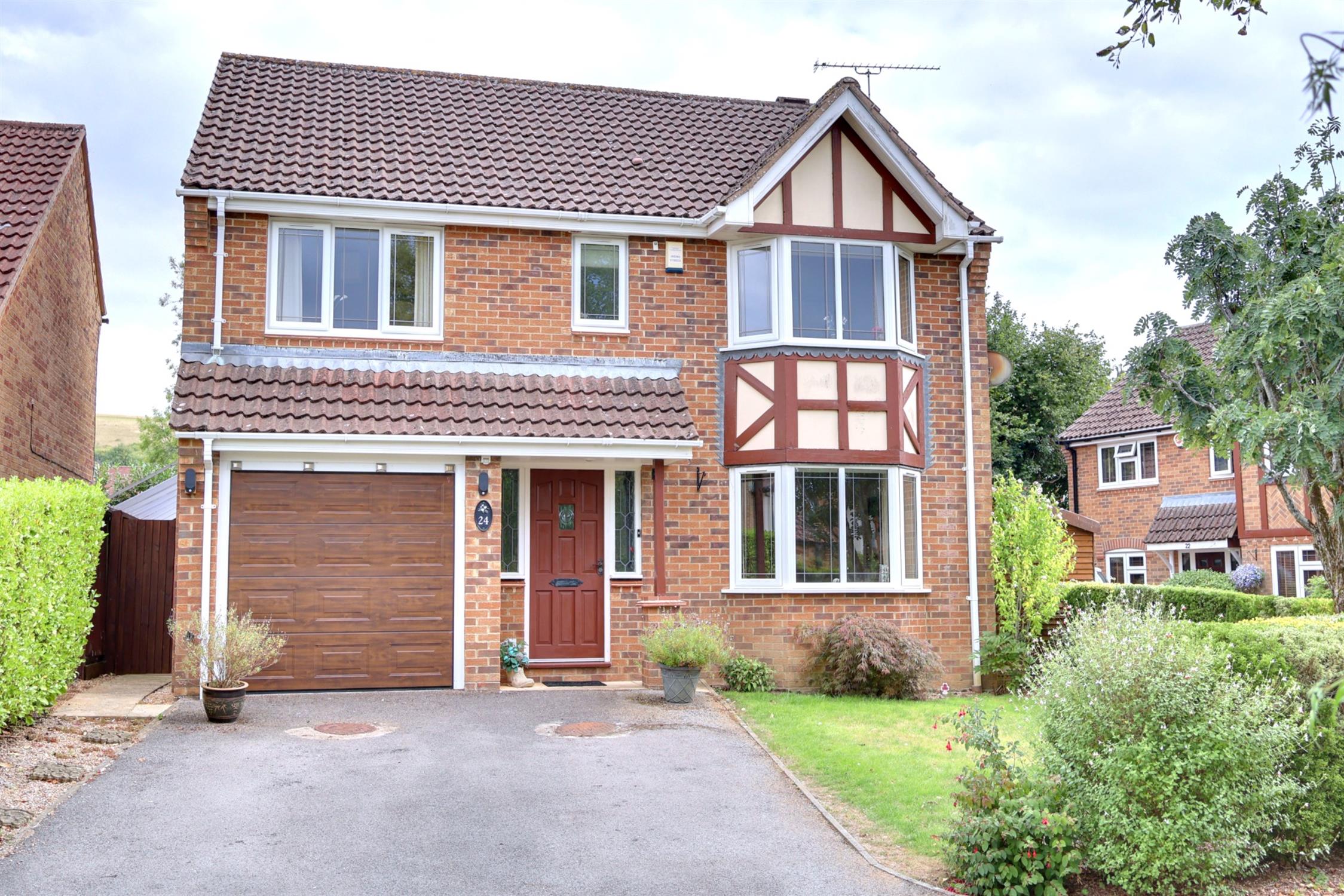 Drive with parking. Lawn garden with shrub hedgerow border. Gated side path to rear garden.