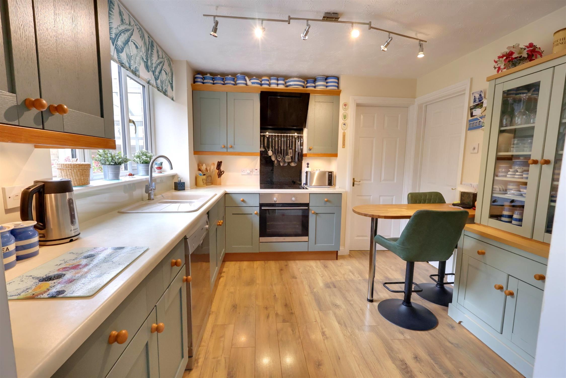 Range of fitted floor and wall units beneath contrasting work surfaces with complimentary tiling to walls. Inset sink unit. Built in electric hob with extractor hood over and oven below. Plumbing for dishwasher. Breakfast bar. Radiator. Double glazed window to rear.