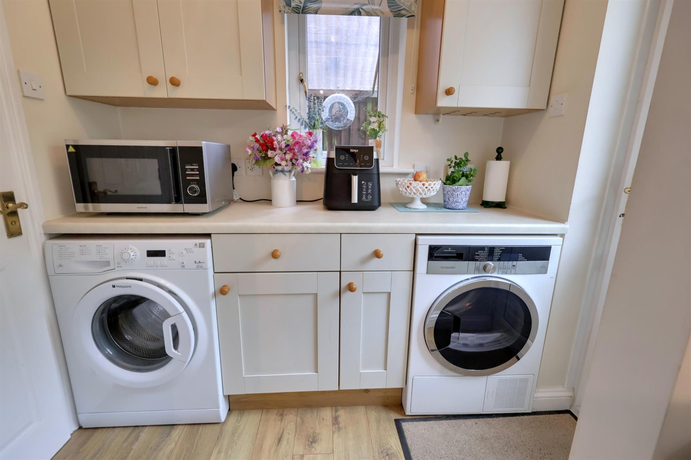 Double glazed door to rear and window to side. Work top with cupboard below. Plumbing for automatic washing machine and space for tumble dryer. Concealed wall mounted gas fired boiler.