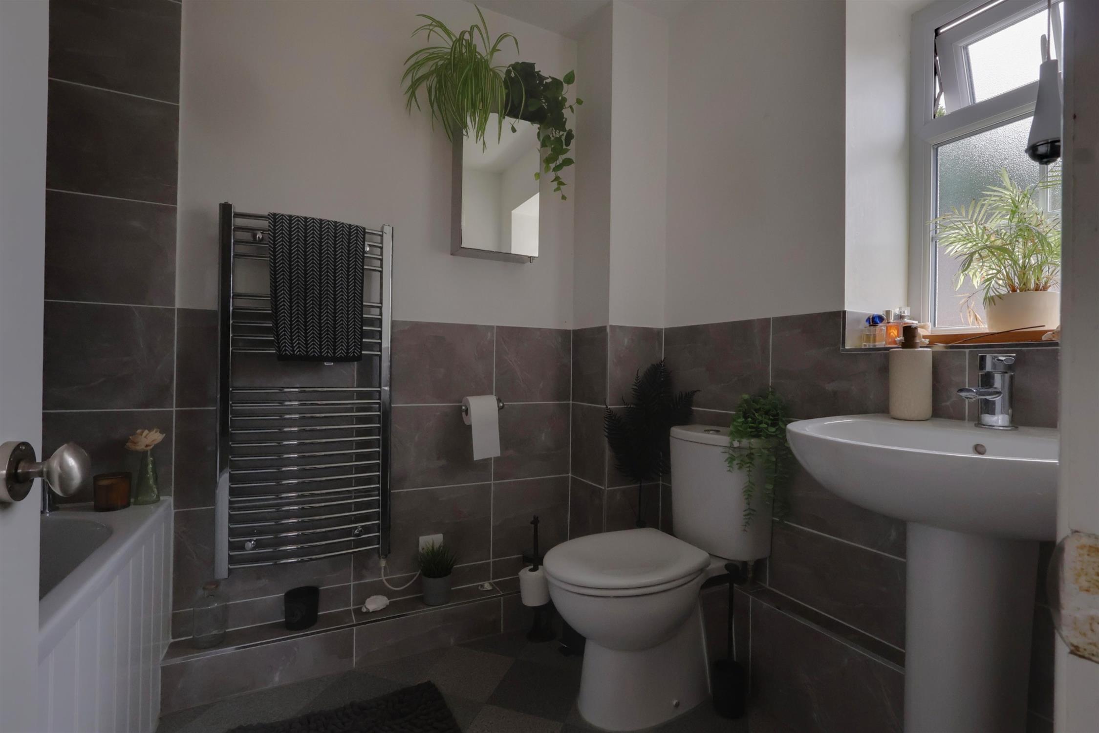 Comprises a three-piece suite, including a panelled bath with shower over and shower screen, low-level WC, pedestal wash-hand basin, ladder-style heated towel rail, part-tiled walls, and an obscured double-glazed window for privacy.