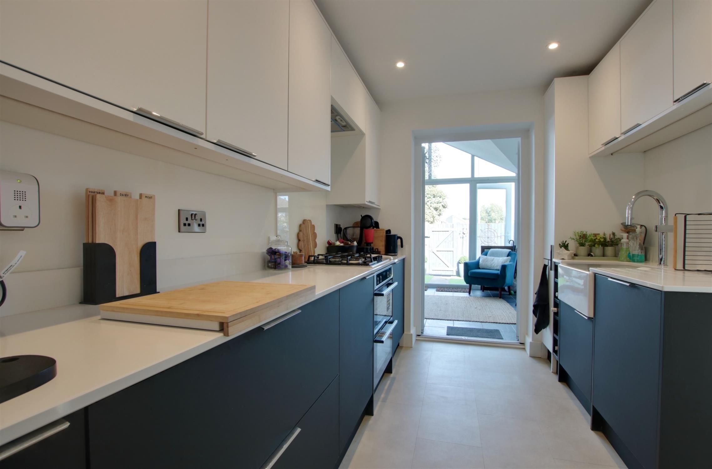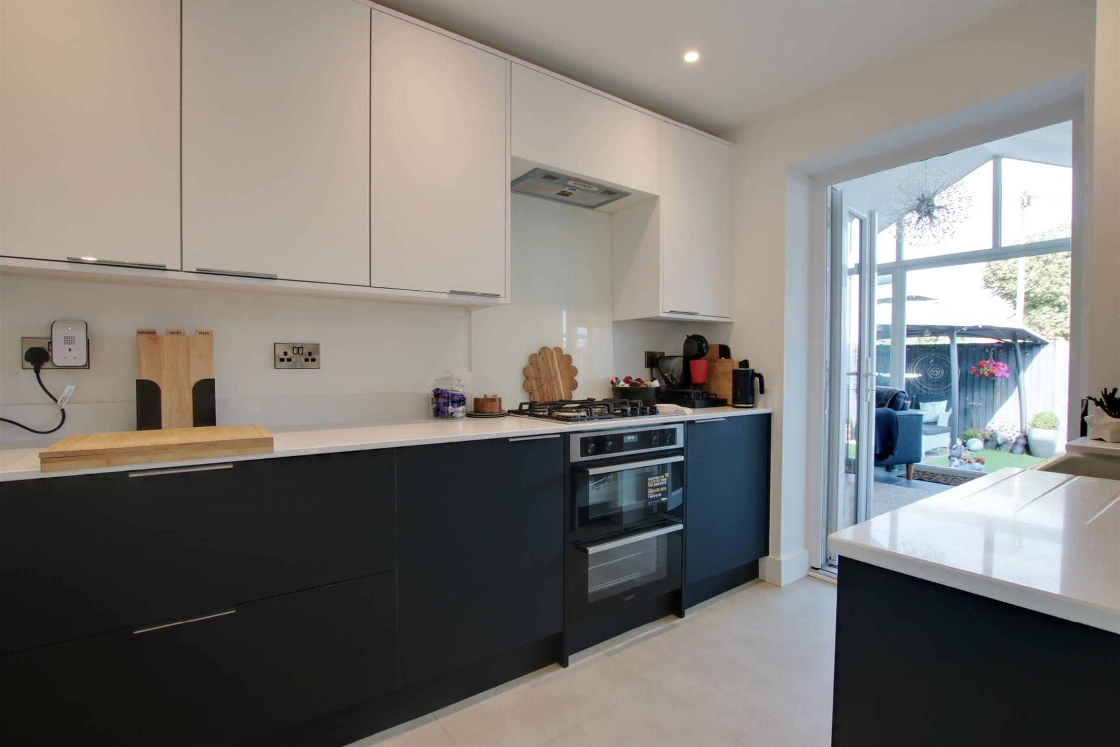 The kitchen was refitted in 2022 by 'Wren Kitchens' and has a range of wall and base level units with quartz work tops over and inset butler sink. Built-in four ring gas hob with double oven and grill under and cooker hood over. Built-in and concealed dishwasher. Understairs storage cupboard. Double glazed French doors to sitting room and part glazed door to: