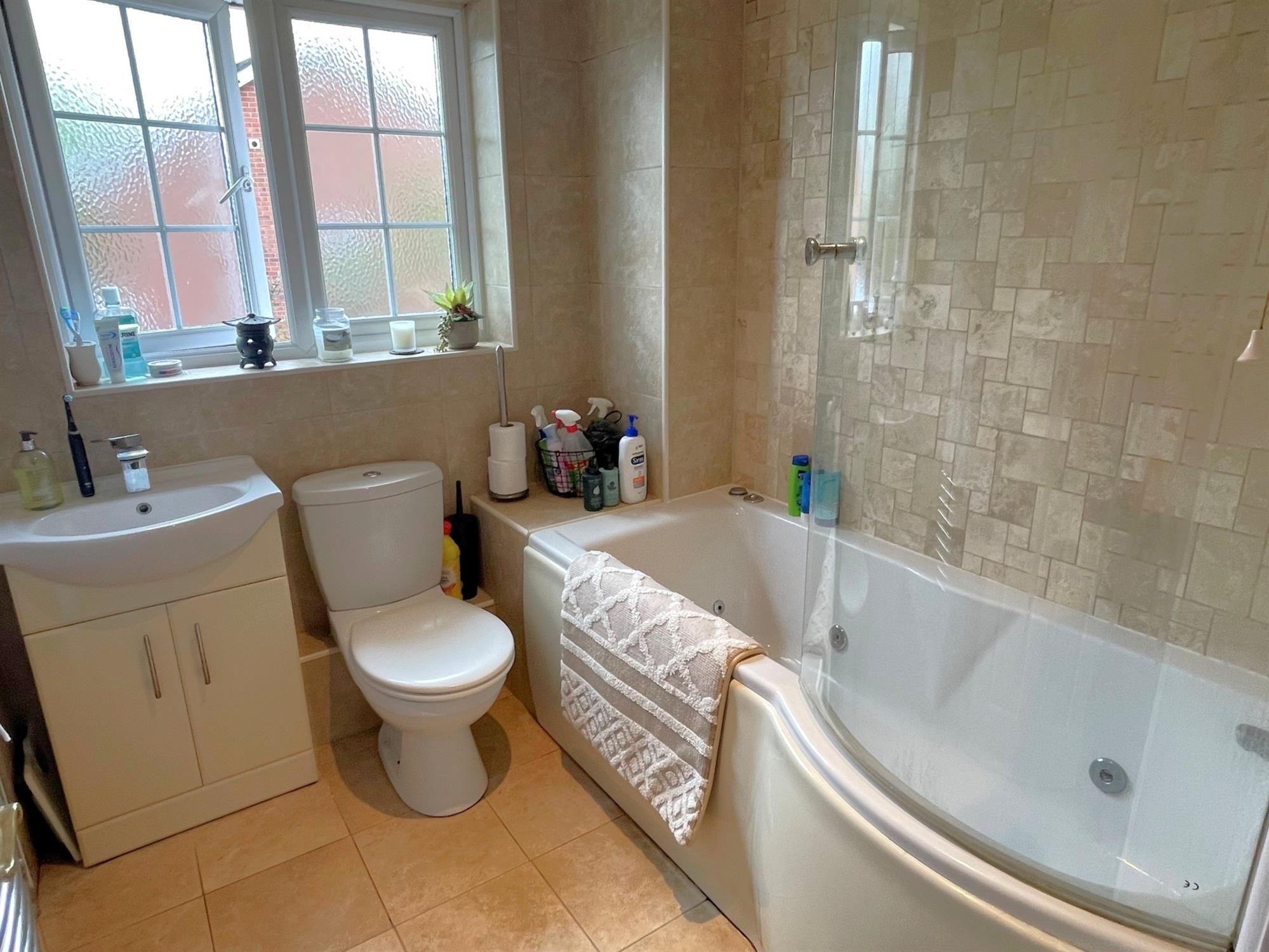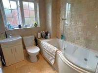 Window to rear. Low level WC. Inset wash hand basin with cupboard below. 'P' shaped bath with glazed screen. Complementary tiling. Heated towel radiator.