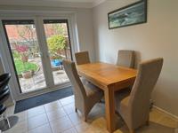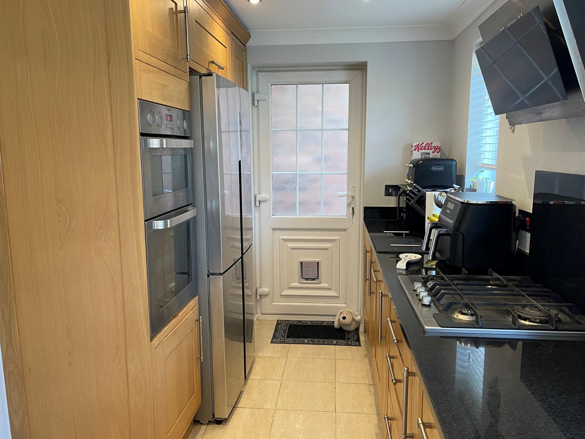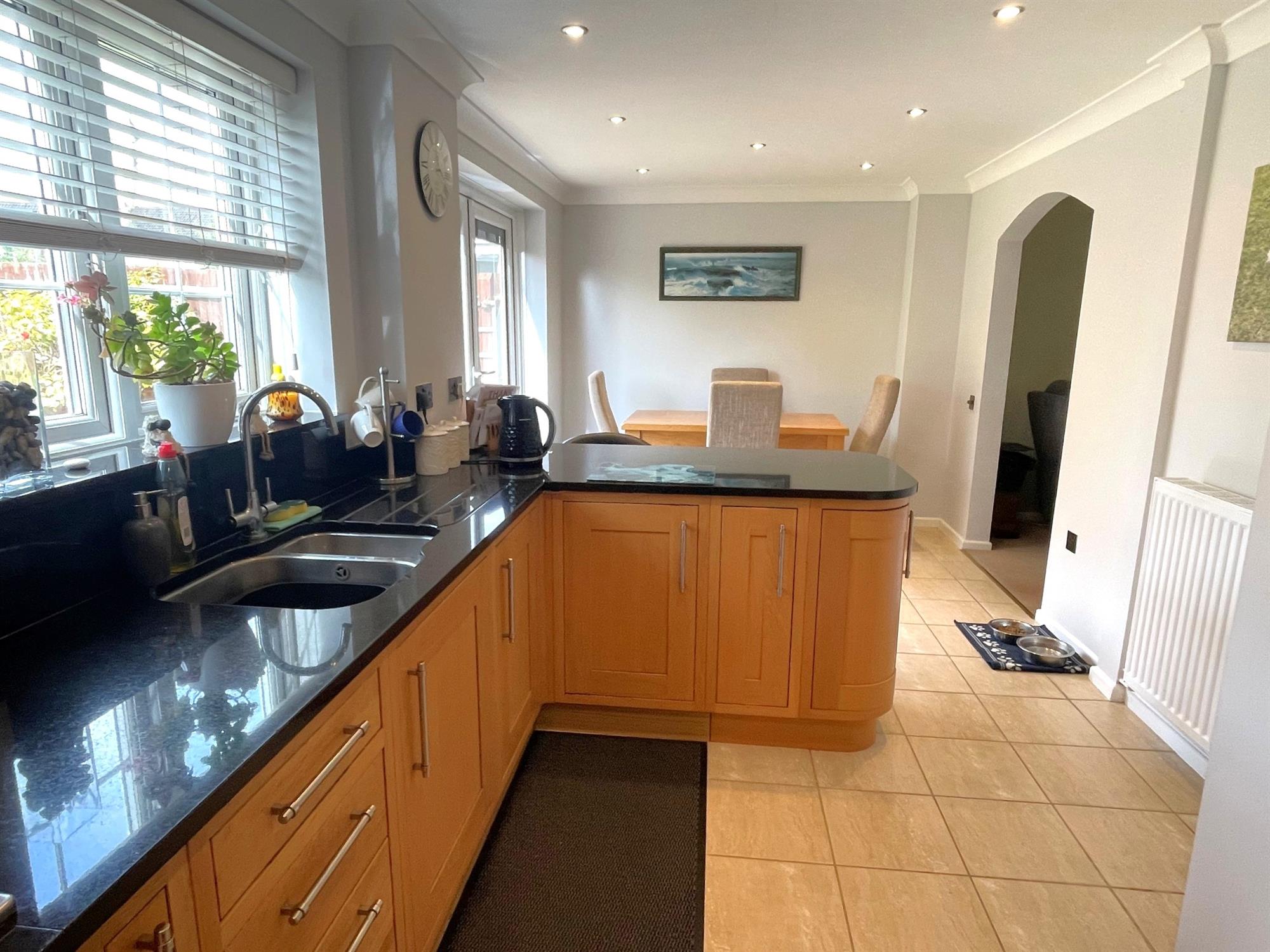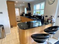Windows to rear. Range of wall and base units with granite work surfaces over. Inset sink with drainer. 4 ring gas hob with extractor over. Built in eye level double oven. Space for American fridge freezer. Integrated dishwasher. Underfloor heating. Radiator. Double opening doors to garden.