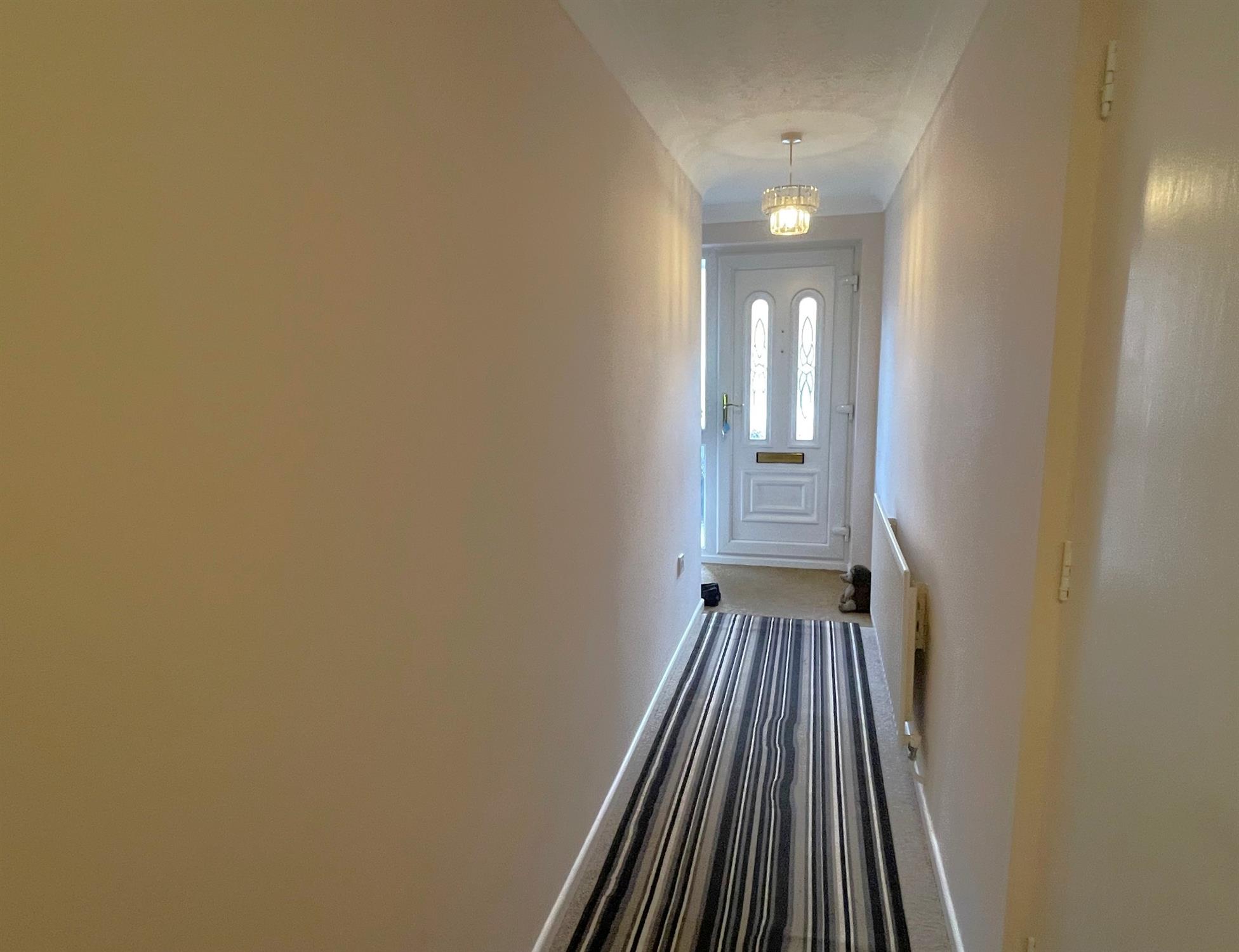 Stairs to first floor. Built in storage cupboard. Door into garage. Radiator.