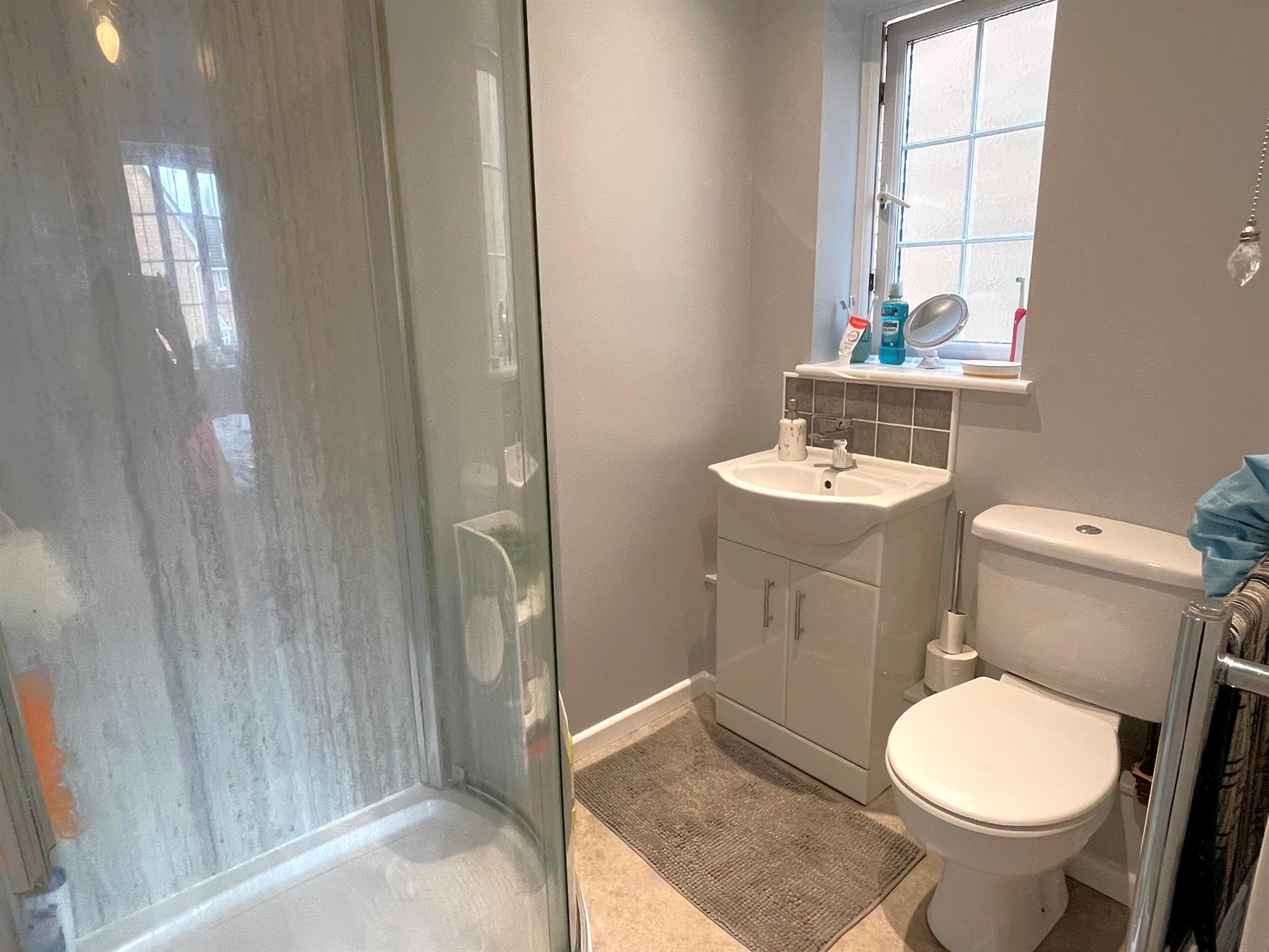Window to side. Low level WC. Inset wash hand basin with cupboard below. Corner shower cubicle with glazed screen. Heated towel radiator.