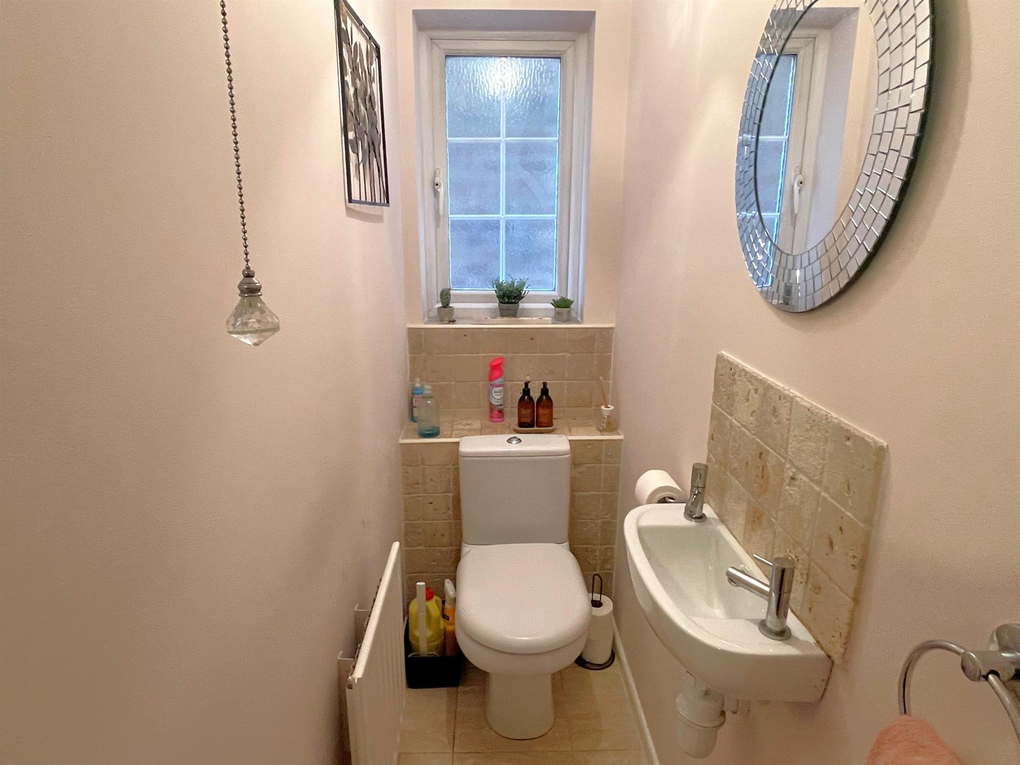Window to side. Low level WC. Wash hand basin. Tiled splashback. Radiator.