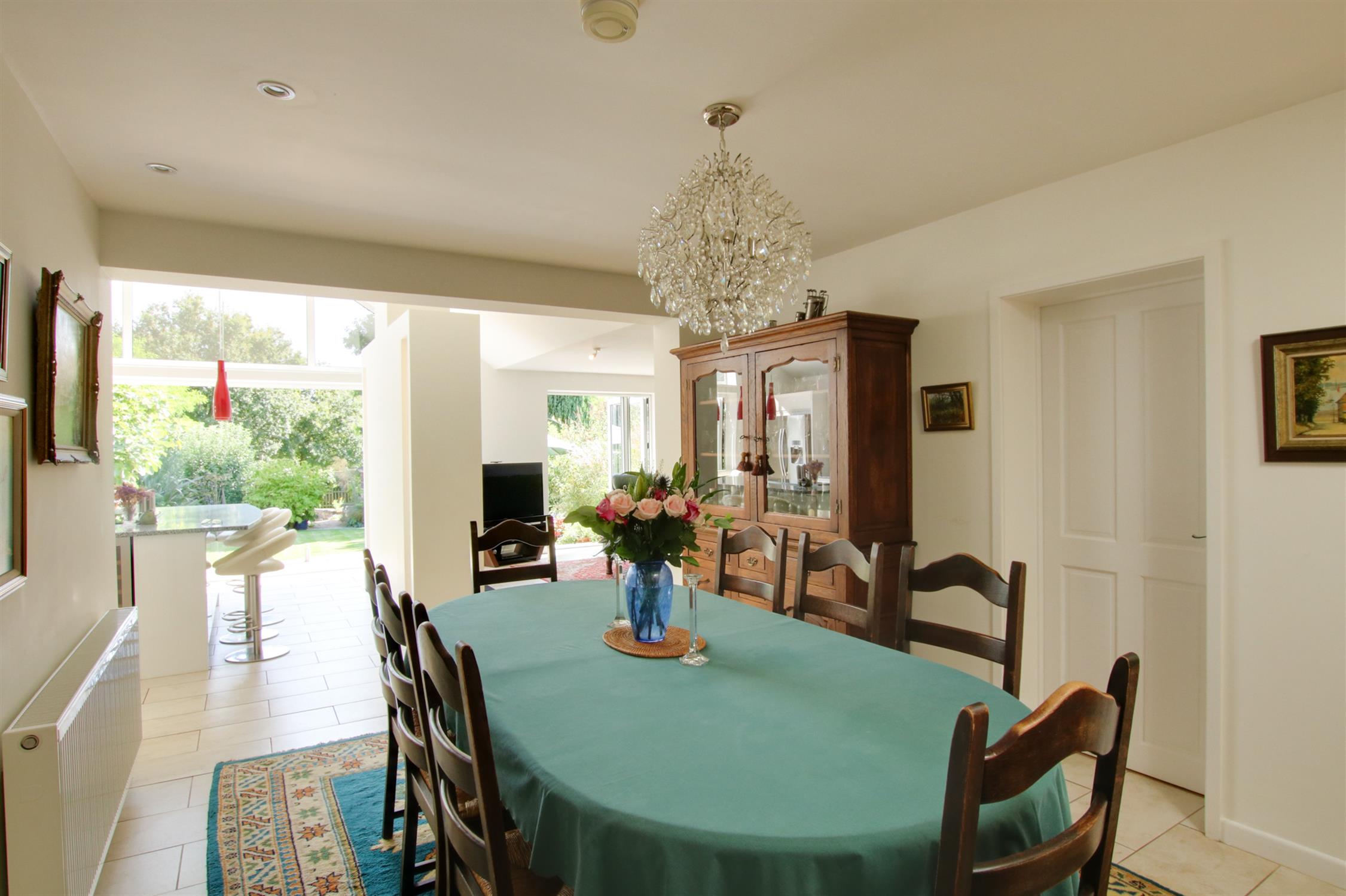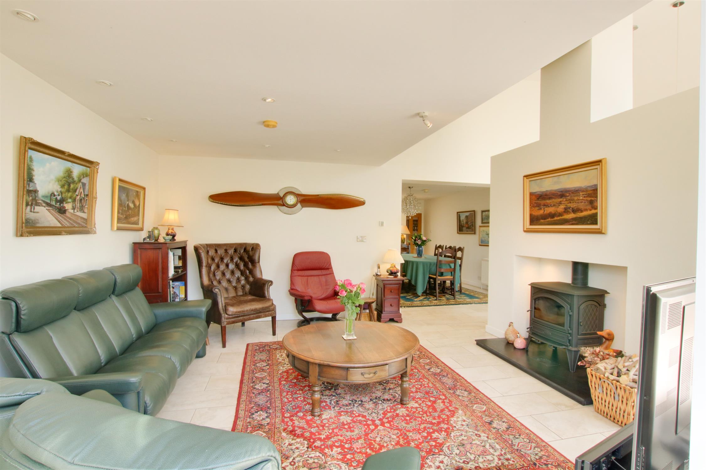Lovely proportioned sitting room, which has a lovely flow from the dining area and kitchen/breakfast room. Designed with an attractive dividing central fireplace, which has a fitted wood burning stove. Double glazed bi fold doors overlooking and leading to the rear garden. Tiled floor. Inset lighting and underfloor heating.