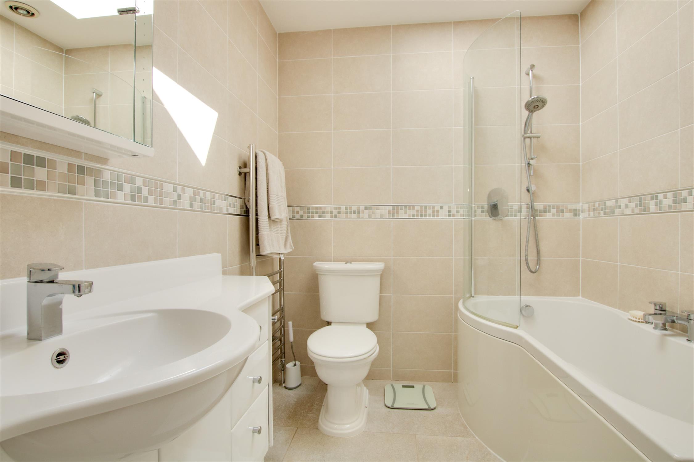 Tiled and fitted with a white suite incorporating a P shaped bath with shower and screen over. Bidet. Low level WC. Vanity unit with wash hand basin and storage cupboards under. Mirror unit with auto lighting over. Heated towel rail. Velux style roof light. Tiled floor.