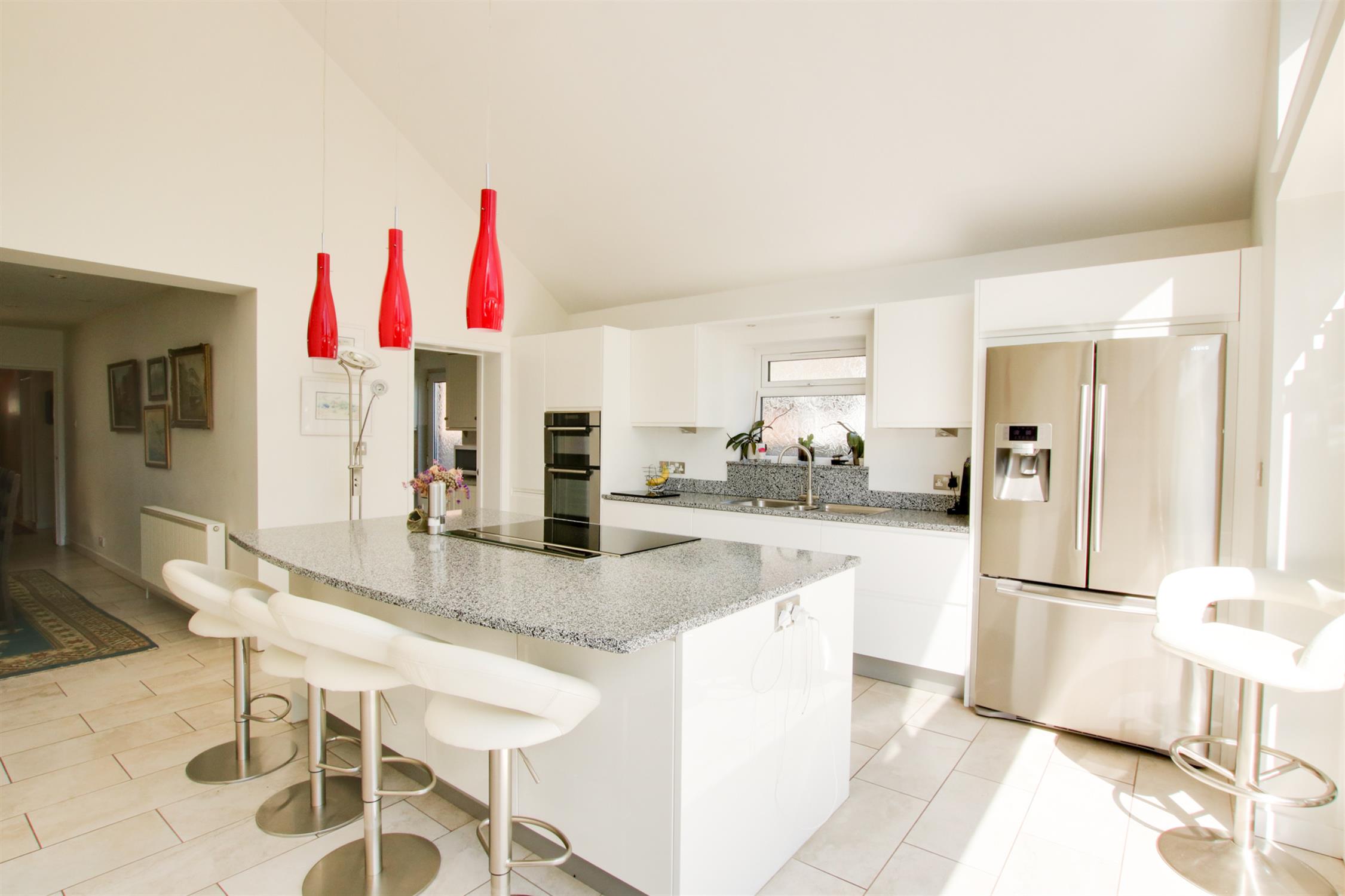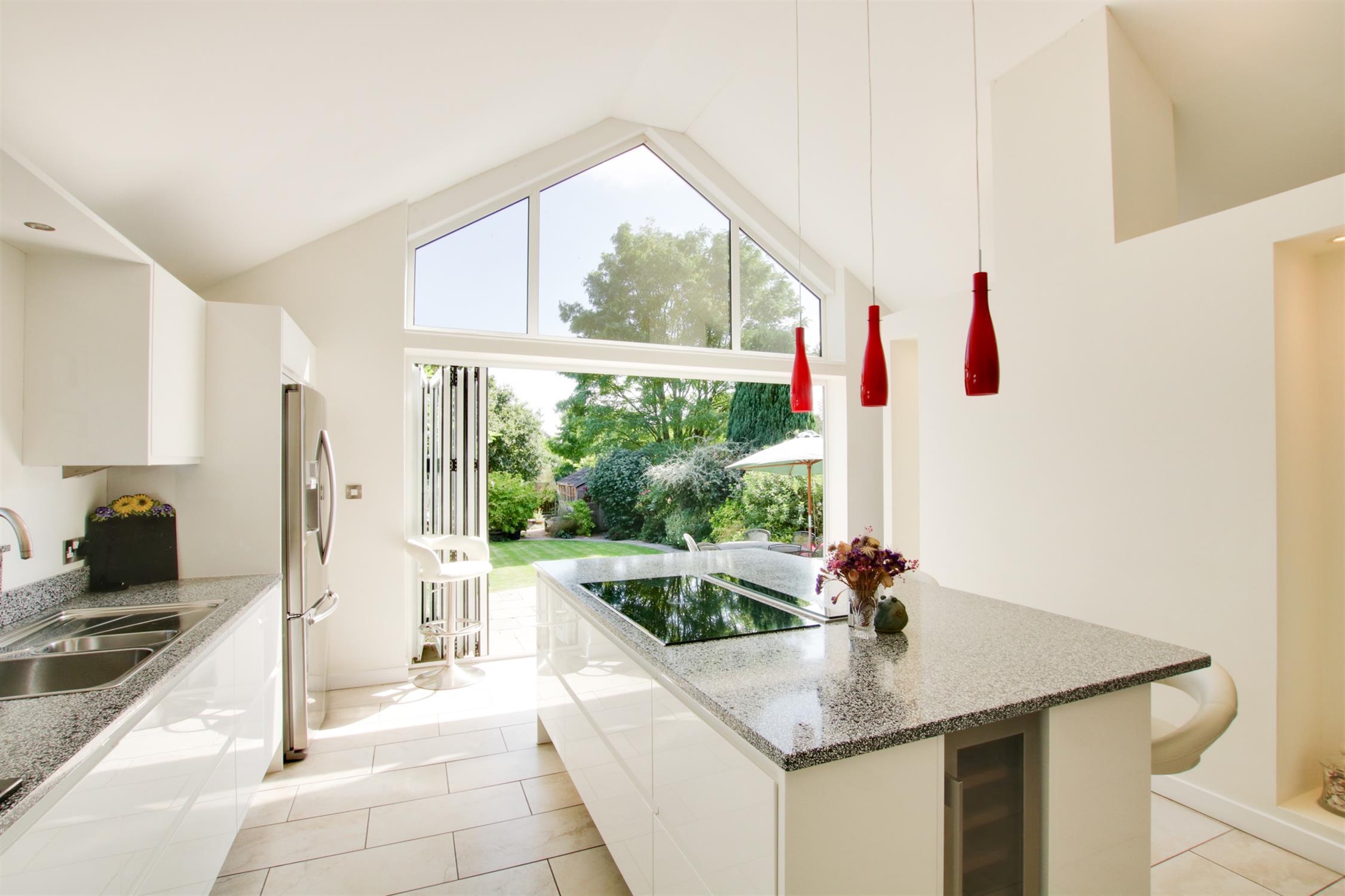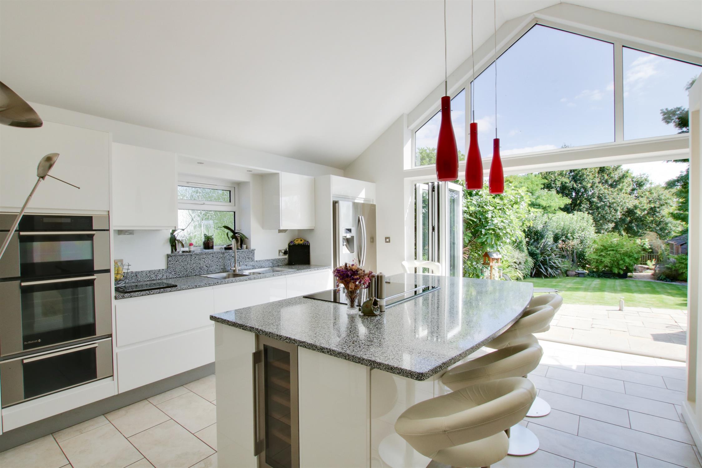 Fabulous open plan kitchen with a vaulted ceiling and double glazed bi-fold doors, with glazed apex over, overlooking and opening onto the rear garden. The kitchen is fitted with a stylish range of units with complimenting Quartz work surfaces which centre around an impressive island unit which incorporates a breakfast bar, together with De Dietrich induction hob and concealed "pop up"extractor fan. There are ample storage cupboards which include pan drawers, pull out larder unit, base cupboards and wall units. Oven housing, with double built in De Dietrich oven and warming drawer. Space for american style fridge/freezer. Wine cooler. Underfloor heating. Tiled floor and door to: