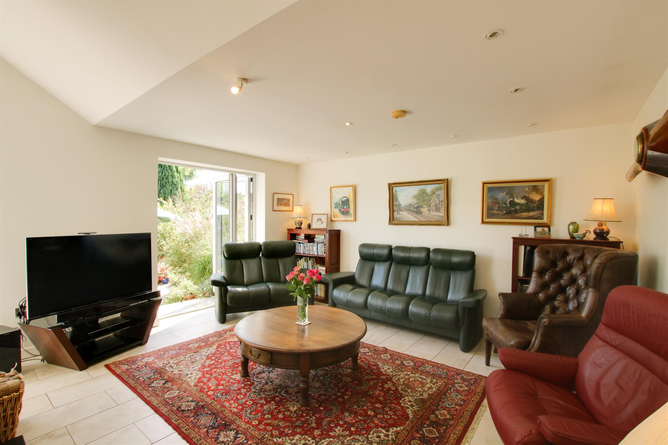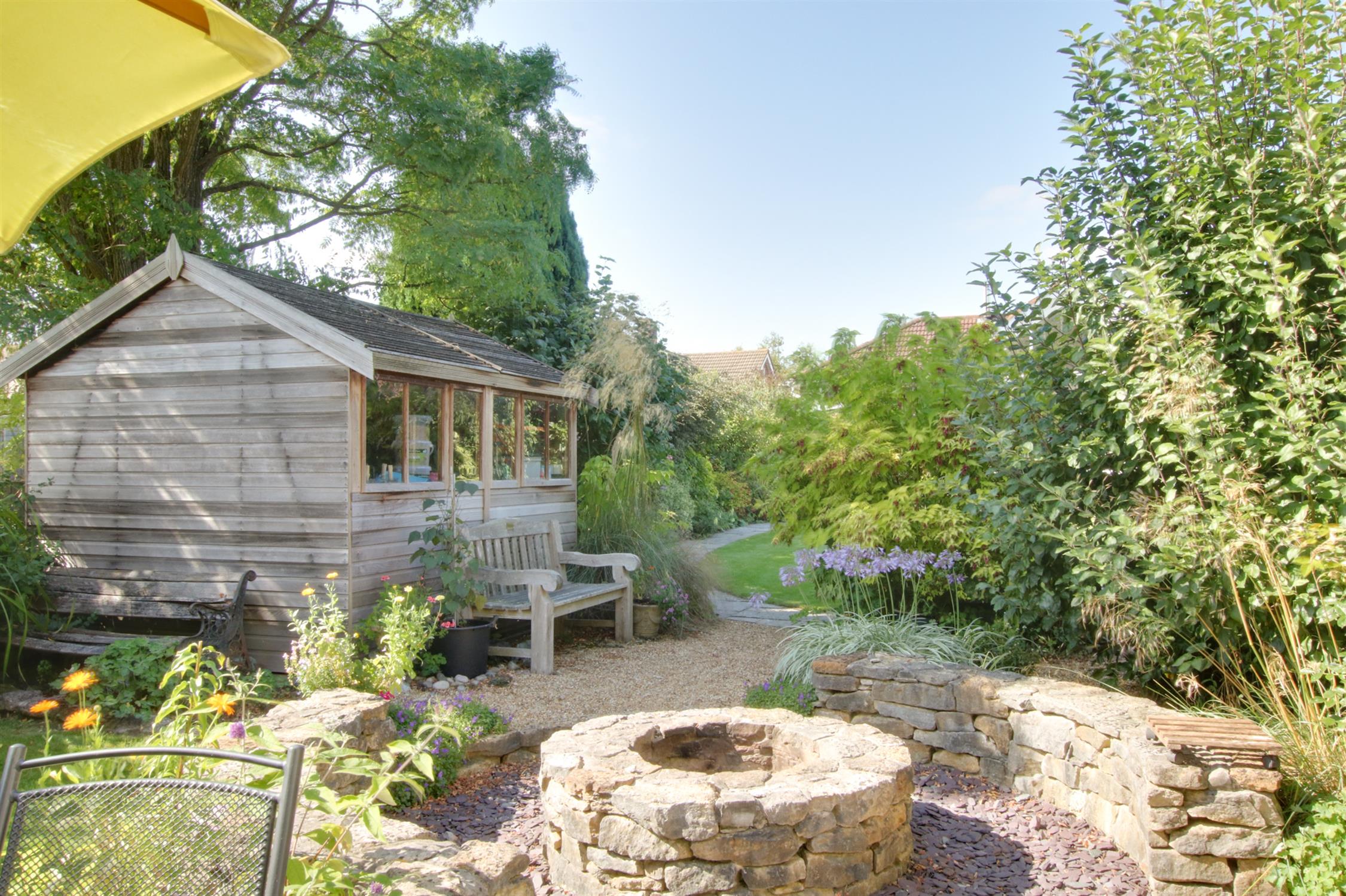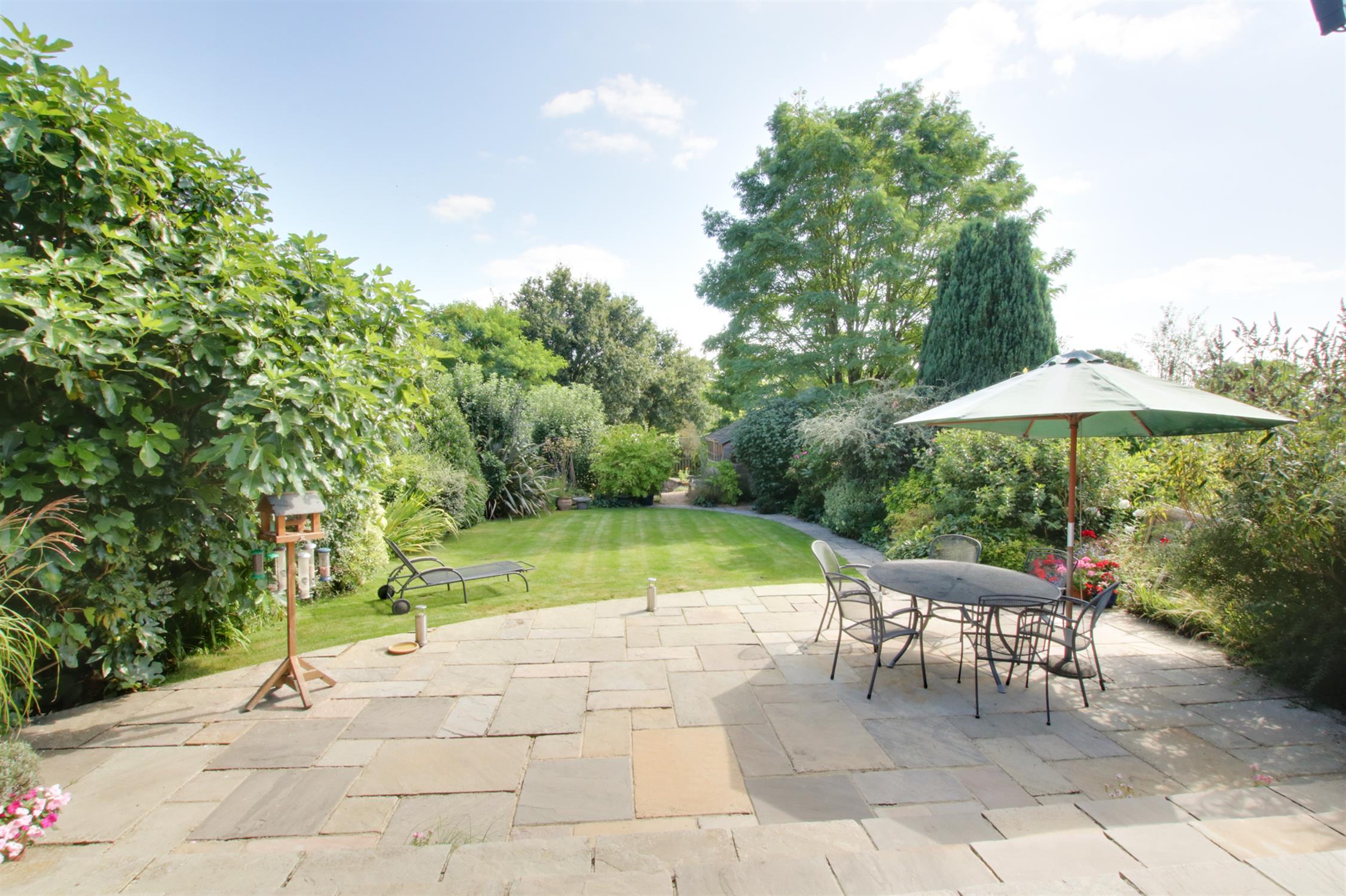 The front garden is a great size, providing for plenty of off road parking and turning. There is side access to the rear garden. The attached GARAGE, has double opening doors, power, light and a personal door leading to the rear garden. The rear garden is beautifully landscaped and planted with mature borders and cottage style planting. There is a large terrace area to the rear of the property. The lawned garden and pathway lead to the lower end of the garden which is attractively screened and planted with a workshop/storage shed, greenhouse and a landscaped Pow-Wow circle around a stone fire pit. There is a super DETACHED HOME OFFICE/GARDEN ROOM, which has two sets of double glazed sliding patio doors, tiled floor, electric radiators, internet and inset lighting.