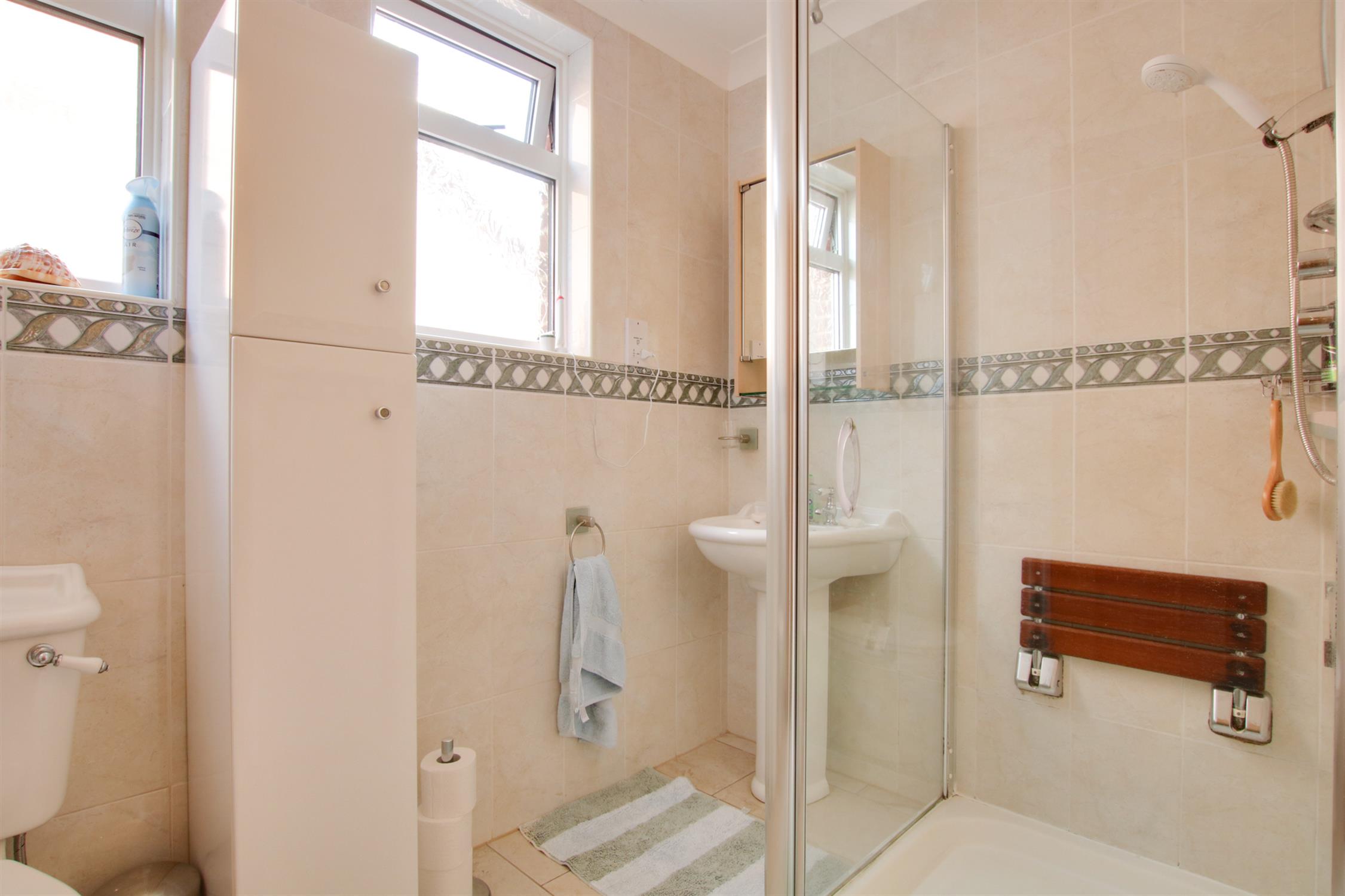 Tiled and fitted with a white suite comprising, tiled shower cubicle, pedestal basin and WC. Tiled floor. Radiator. Inset lighting. Two double glazed windows to the side aspect.