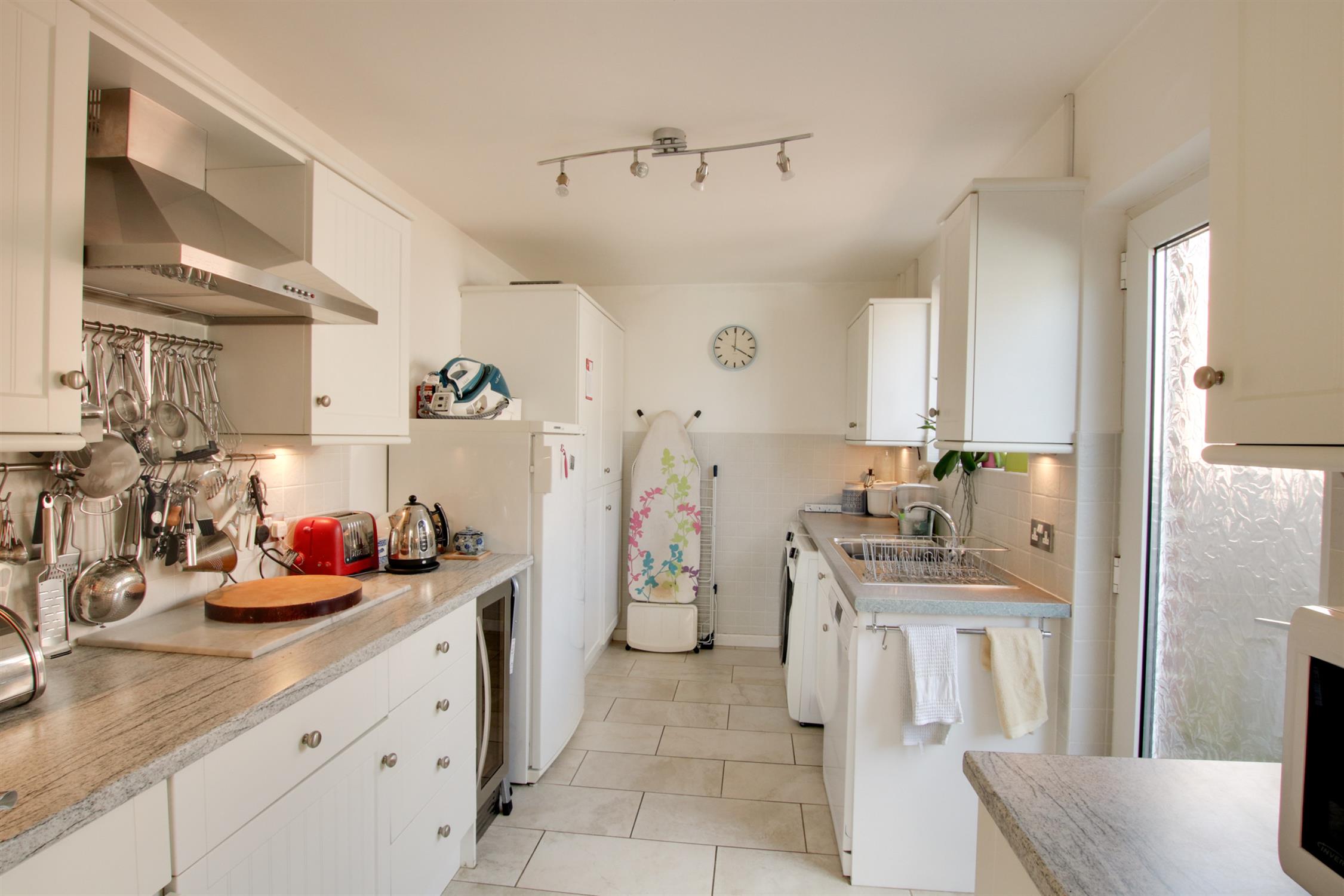 Spacious utility room, which is well fitted with a range of units which include base cupboard and wall units. Single drainer sink unit with mixer tap over. Broom cupboard. Integrated fridge/freezer. Space for dishwasher, washing machine and tumble dryer. Tiled floor. Double glazed door to the side garden.