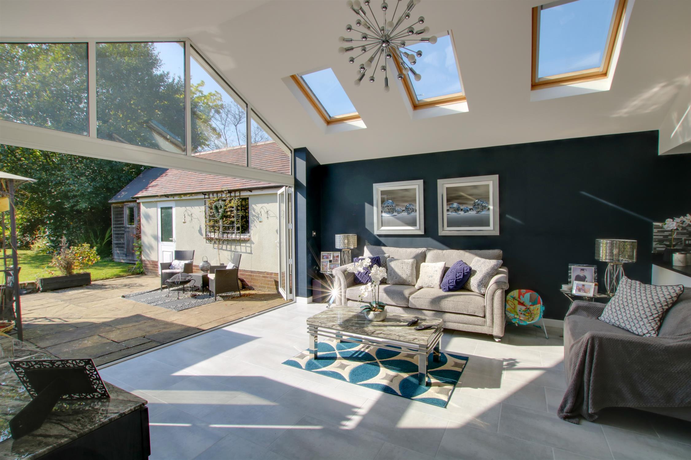 Fabulous and spacious open plan room, incorporating a stylish fitted kitchen with Granite worksurfaces. One and a half bowl sink unit with mixer tap over. Integrated dishwasher. Appliance spaces for a range style cooker and fridge freezer. The kitchen/dining and living area has a tiled floor throughout with under floor heating and inset lighting. The room is superbly light and bright with a full height open eave ceiling in part, which incoporates three velux style windows. Full width double glazed bi-fold doors opening onto the rear garden and double glazed apex above. Thermostat control and door to: