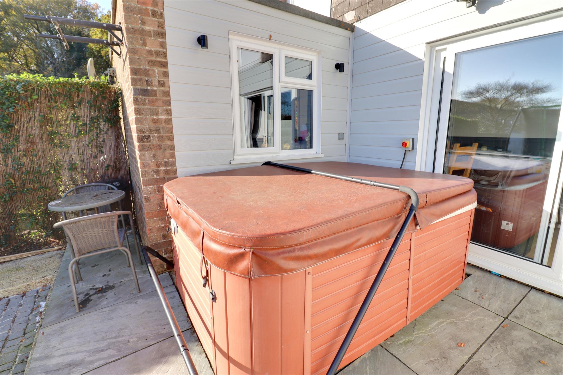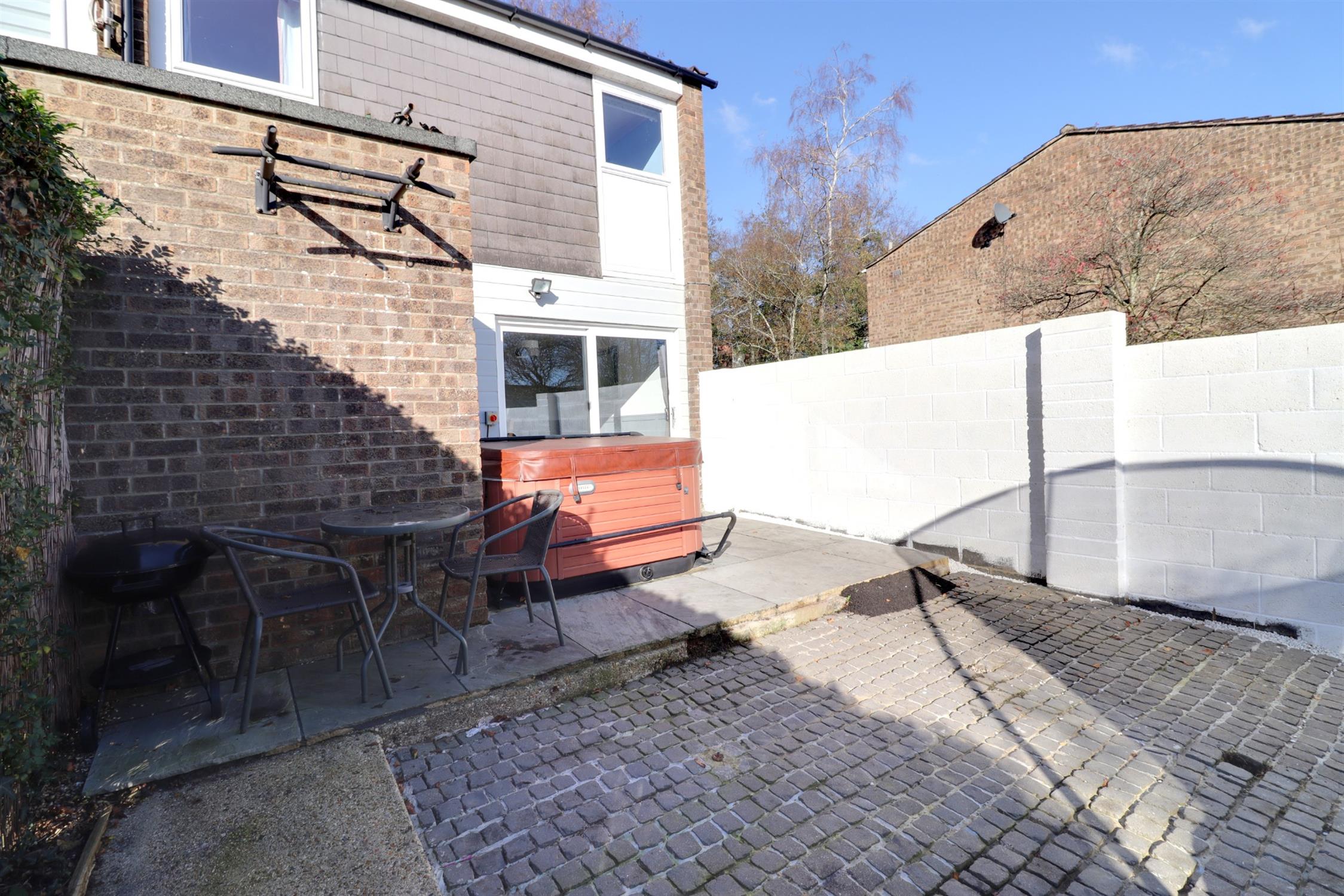 Breeze block wall enclosed with paved patio and brick cobbled area, four person hot tub to remain, external lights, pedestrian rear gate.