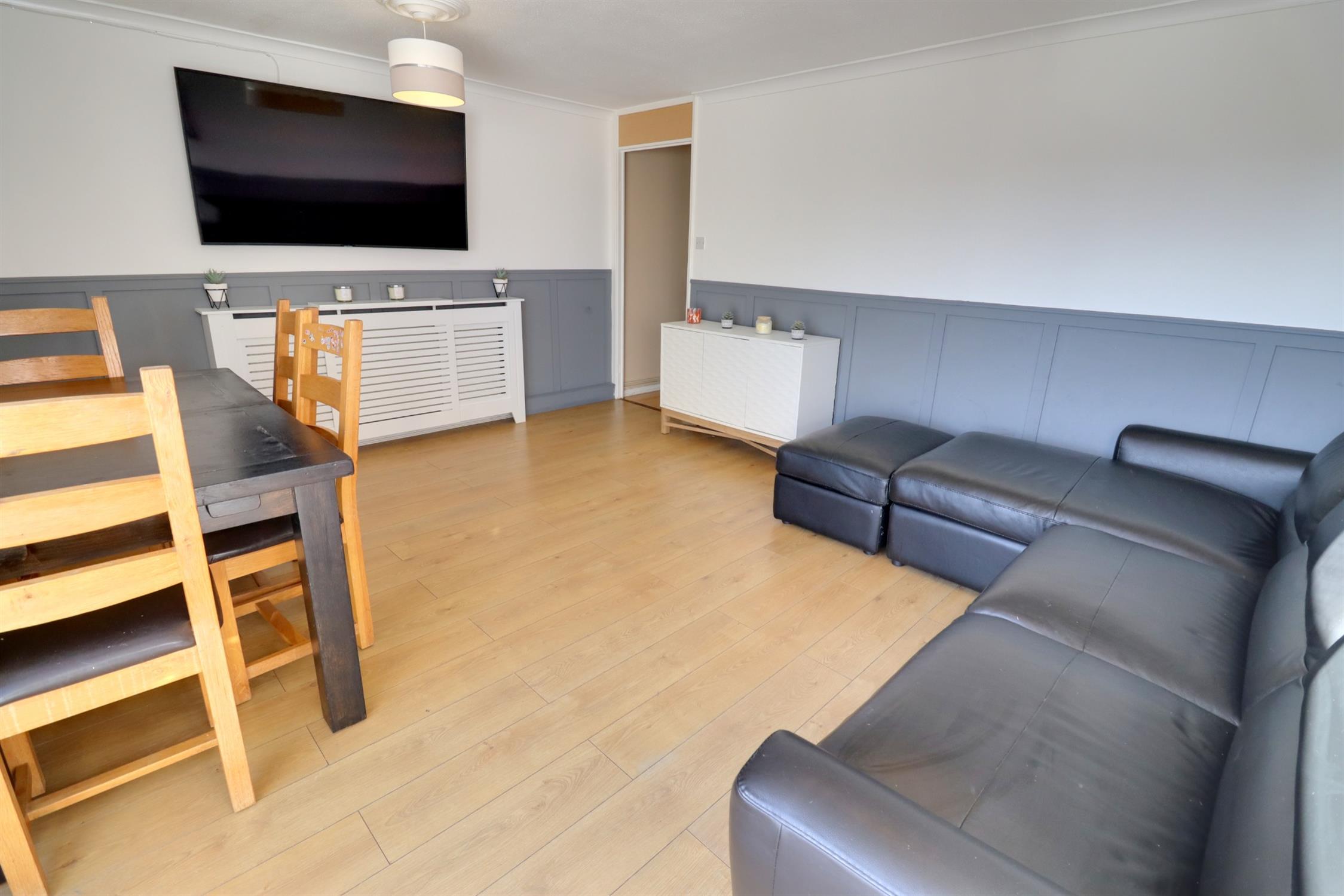 Double glazed sliding patio doors to rear garden, laminate flooring, radiator with radiator cover, door to: