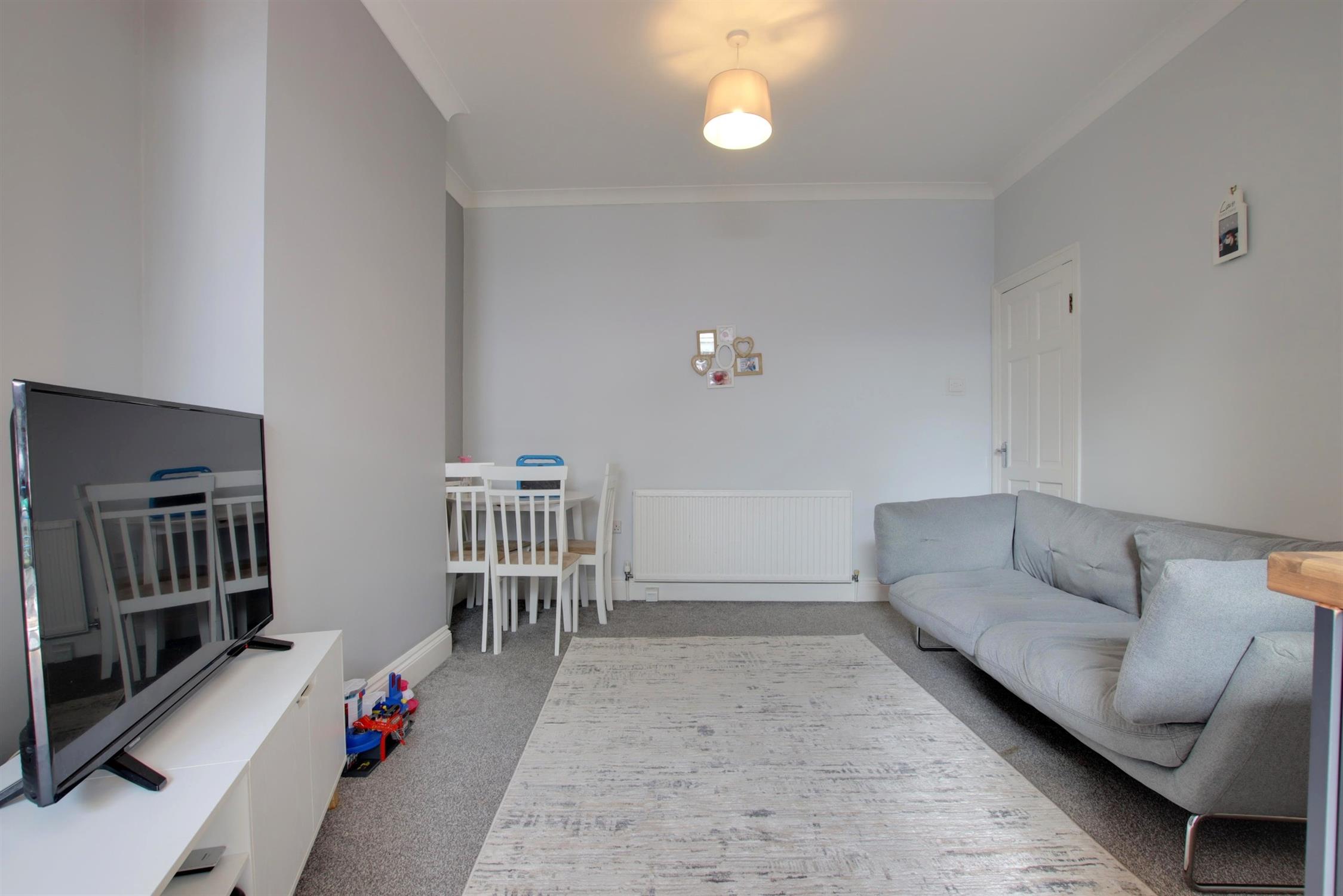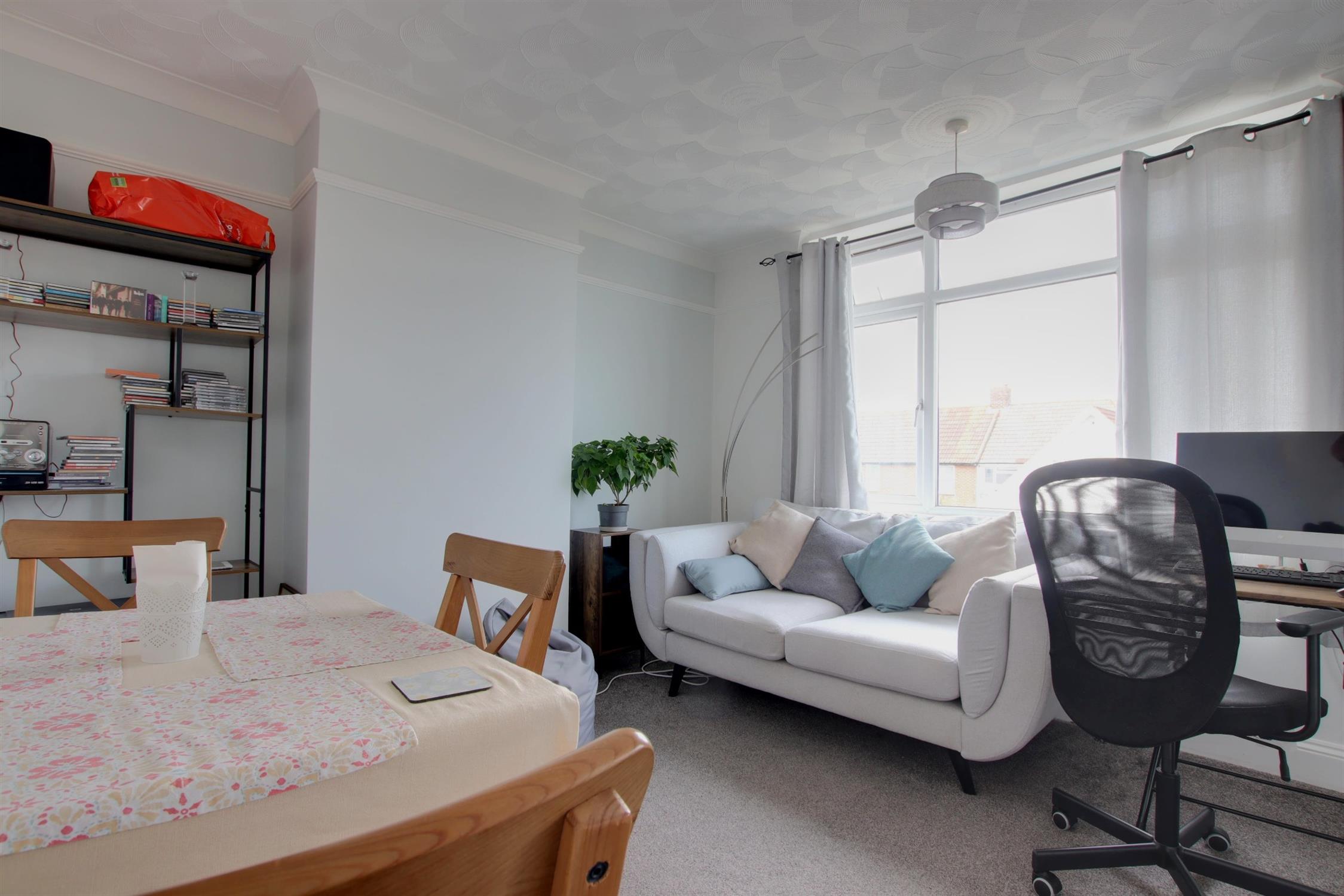 Smooth and coved ceiling. Radiator. Door to bedroom two. Opening to the kitchen.