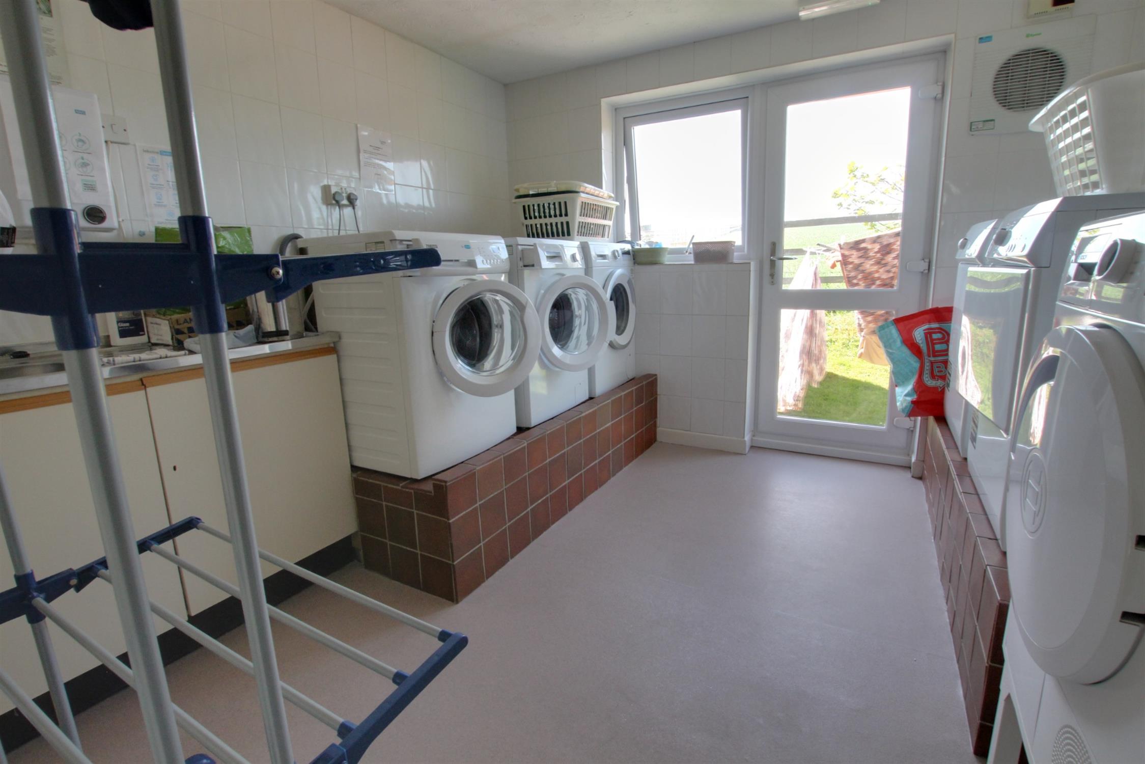 Multiple washing machines and driers, door to outside communal clothes airers.