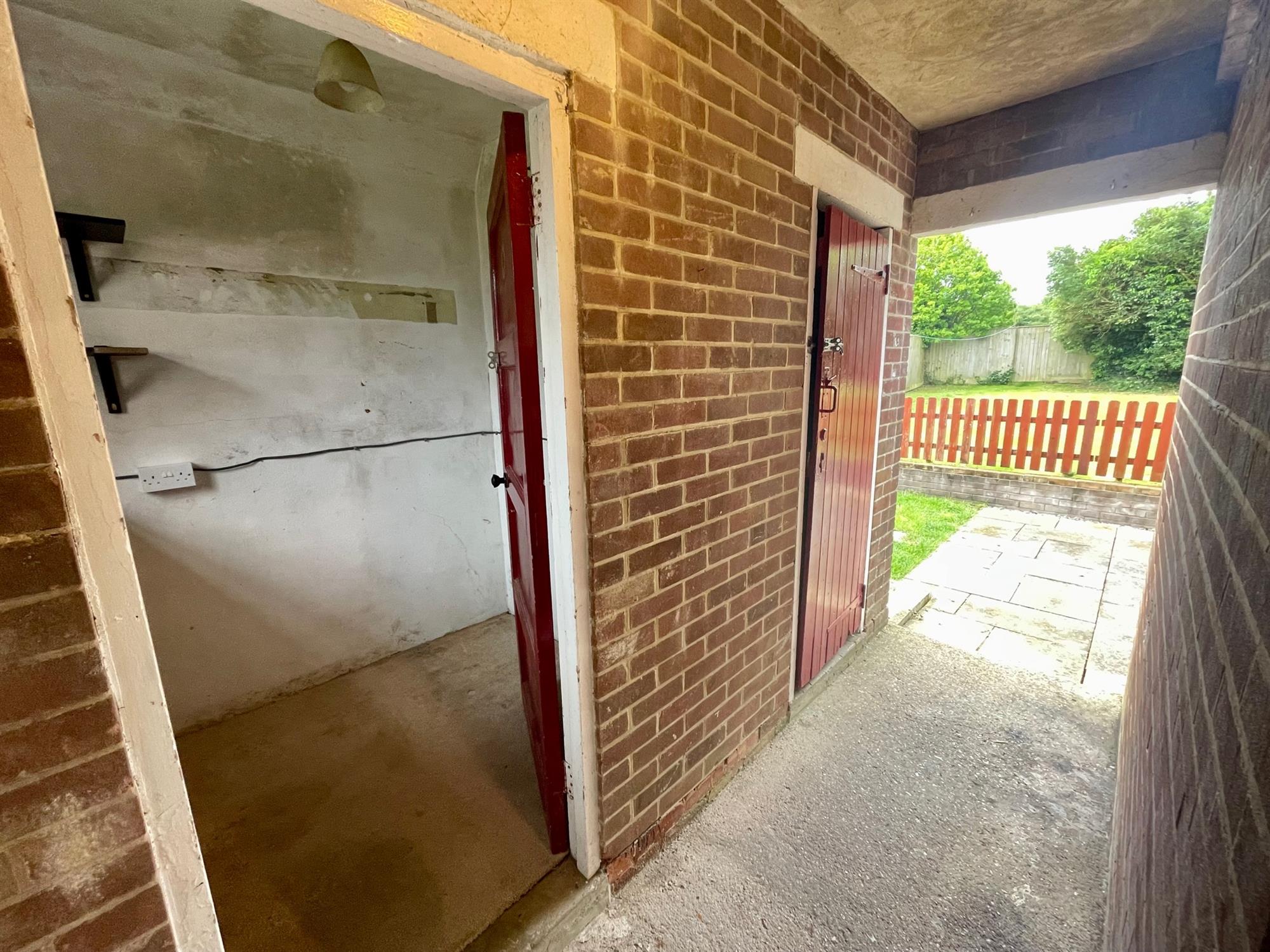The property sits well back from the road and is accessed via a paved pathway and a step up to the covered front door. To the front, there is a well-tended garden that is laid to lawn, and a door to the side provides access to the covered corridor leading to the workshop, store, and rear garden.