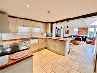 Ample space for utilities and fridges, high and low level units, stainless steel sink, and solid wood worktop. Skylight and stable door to the side return.