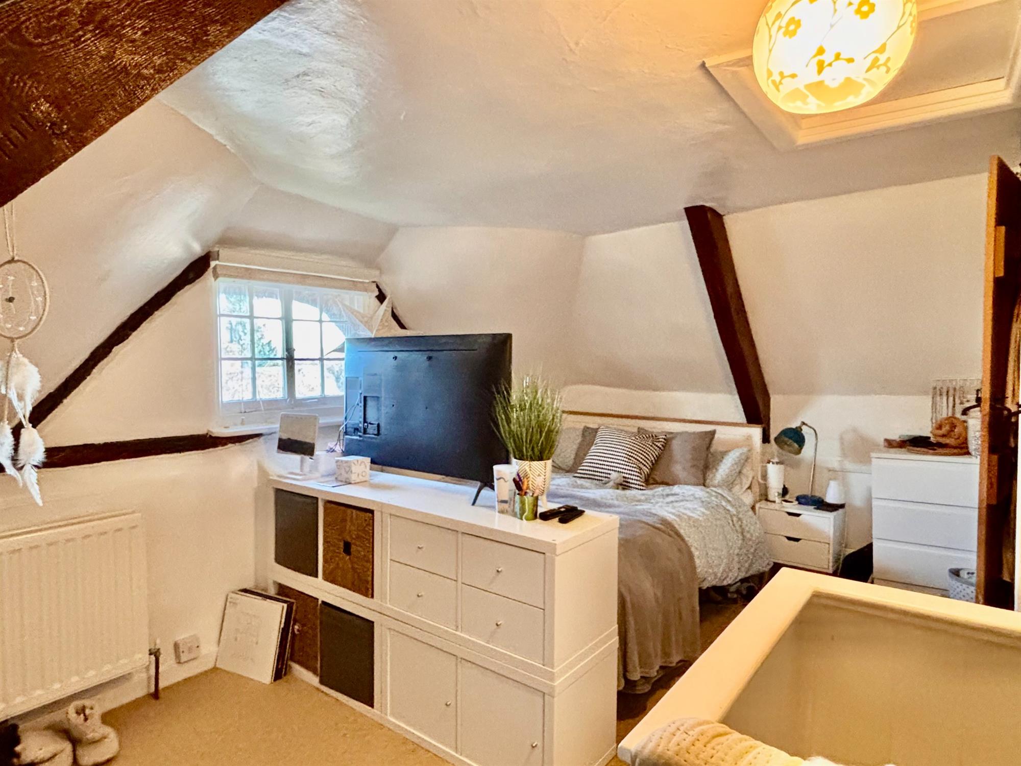 Double bedroom situated on the second floor with ample eaves storage, wardrobe, and ensuite offering corner shower, basin, and toilet with heated towel rail.