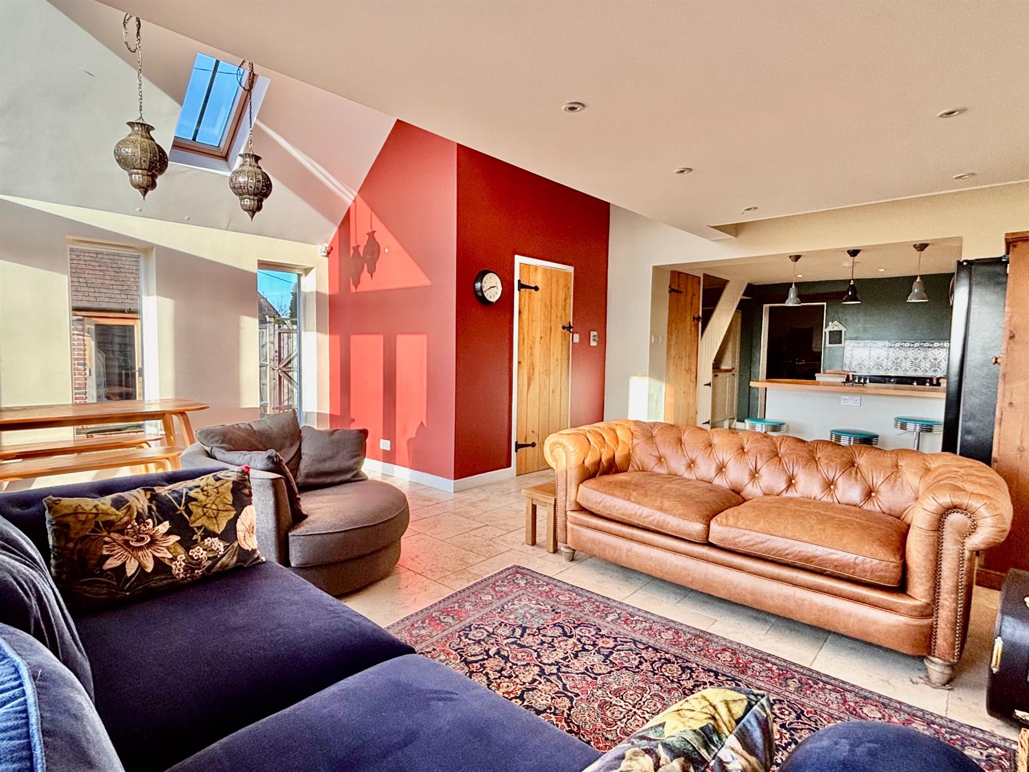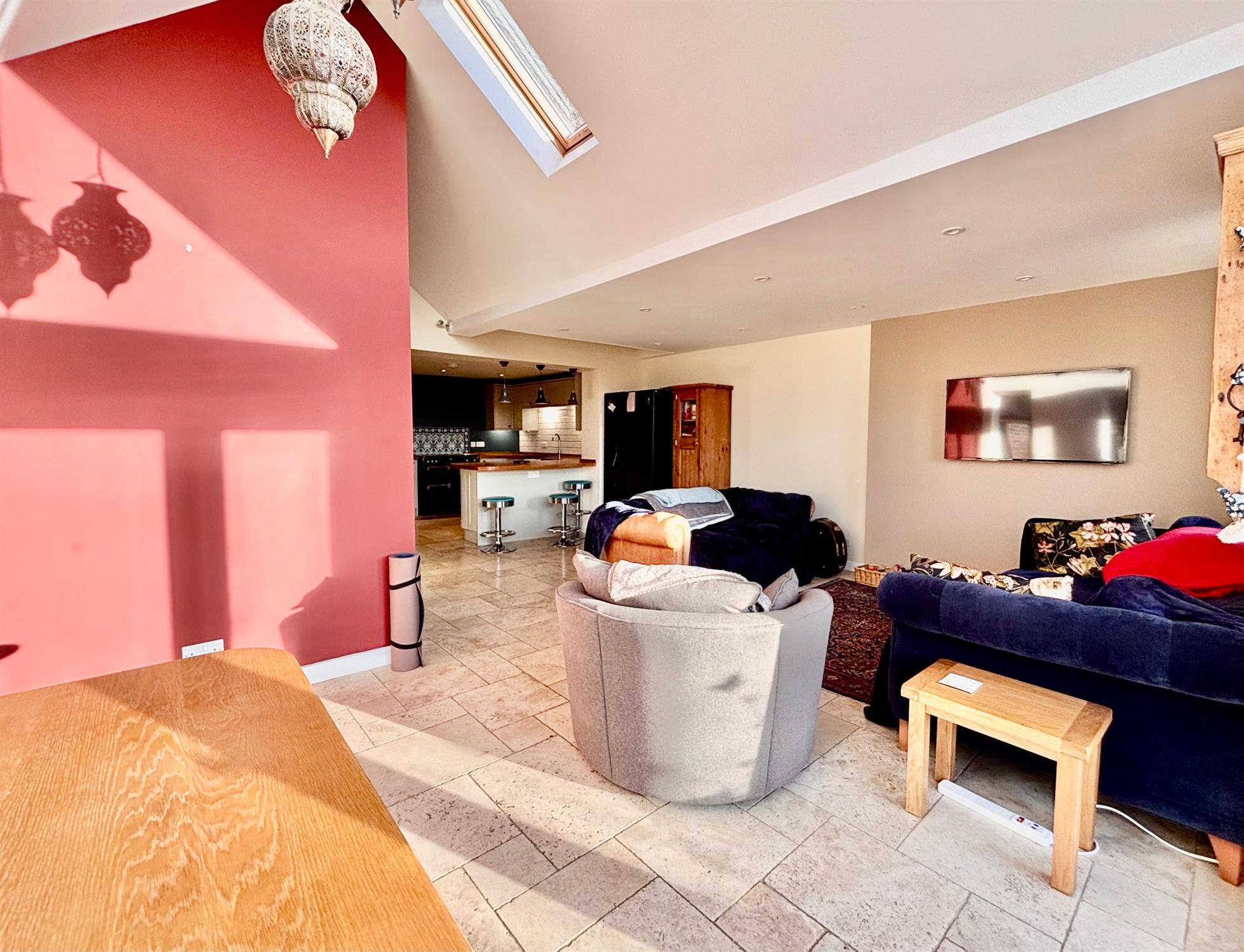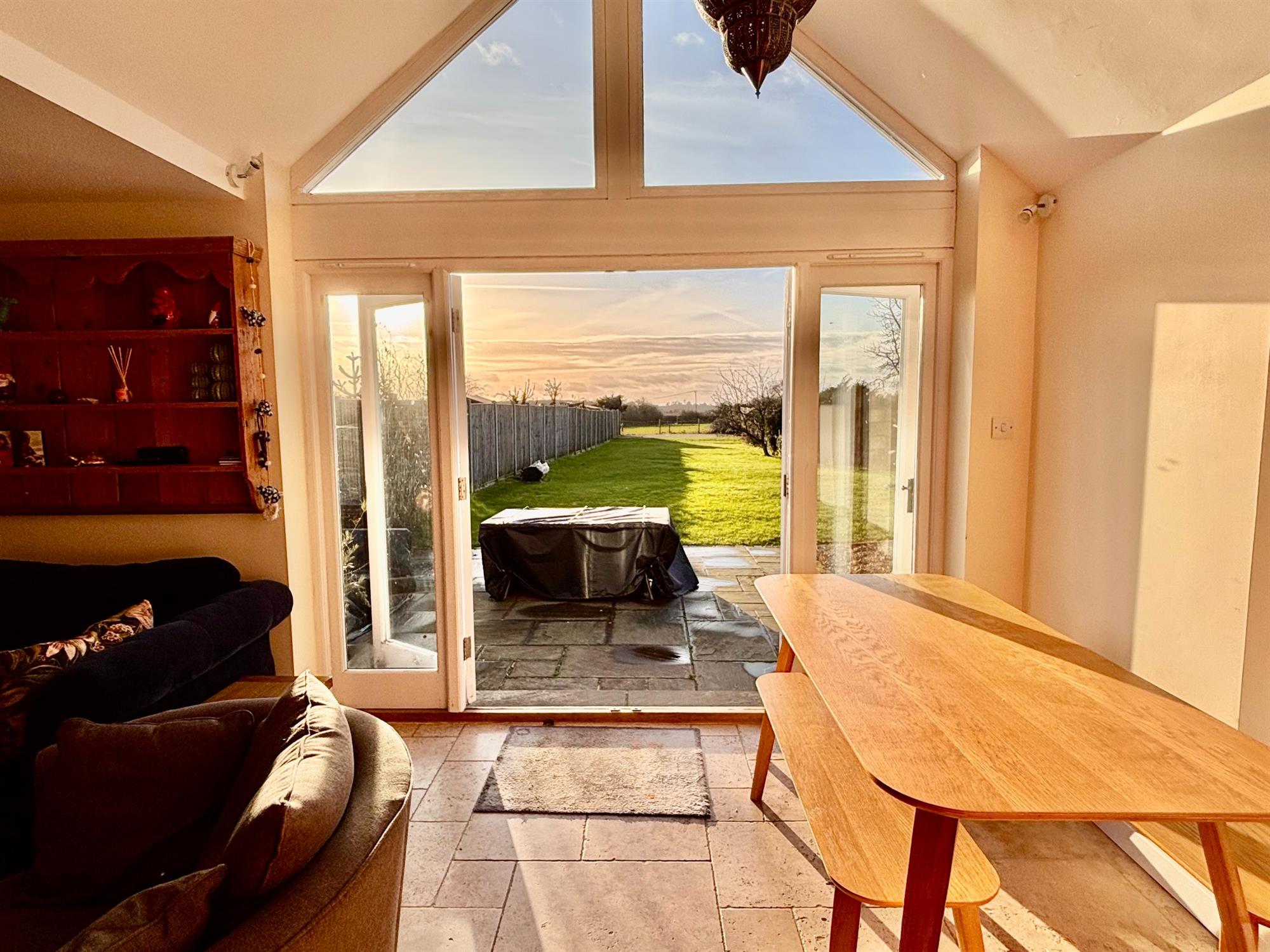 One of the keen highlights of the house. A spacious extended reception space with cathedral pitch windows, double doors to the rear garden and beautiful views down the length of the garden and windows to the side.