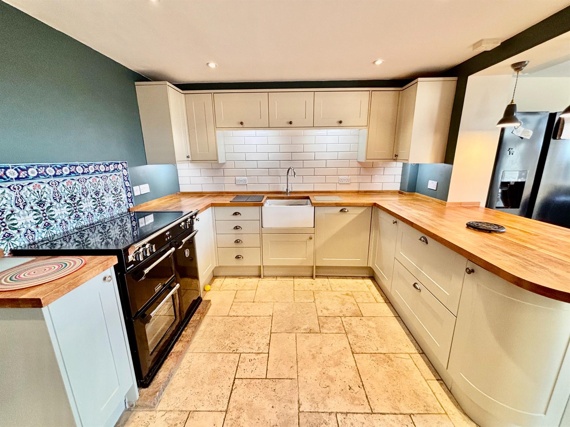 Stone tiled flooring throughout the kitchen and living space. Solid wood worktops with high and low level units in light sage, Stoves range oven with five ring induction hob, inset butler sink, integrated Bosch dishwasher and various further storage solutions. Door to these stairs and glass panelling.