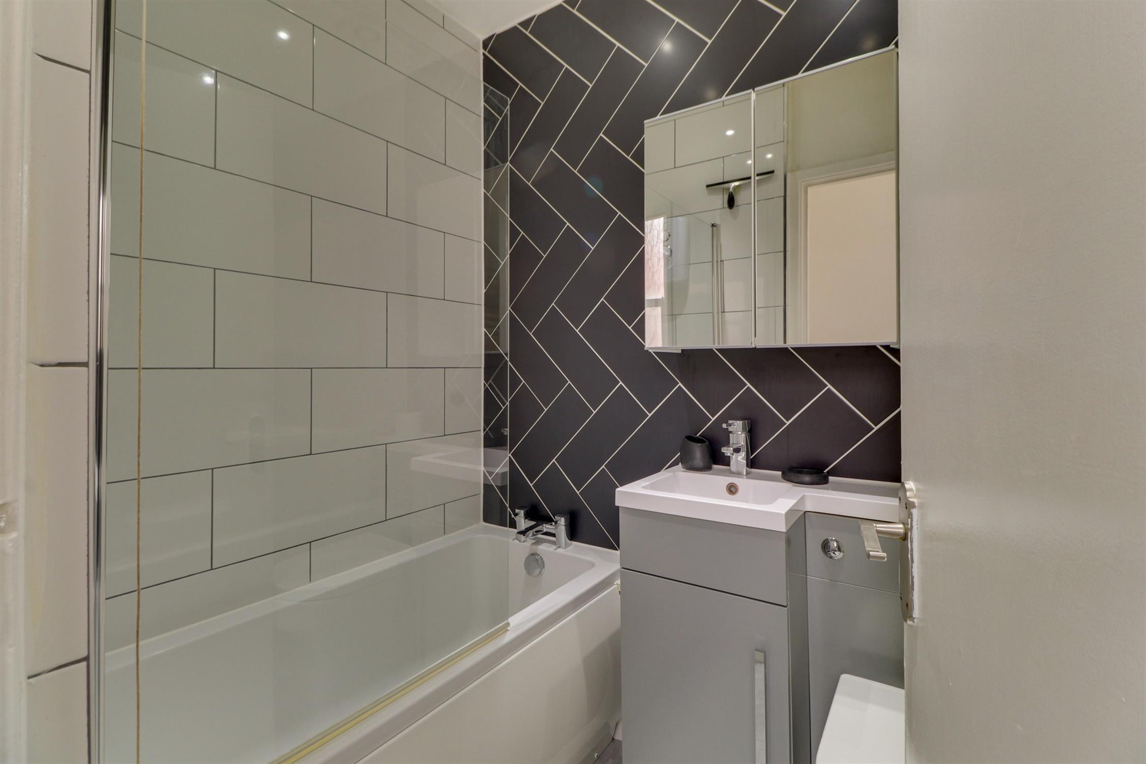 Smooth ceiling with inset spotlights, extractor fan, bath with shower over, wash hand basin, low level W.C, ladder towel radiator, tiled splash back and laminate flooring.