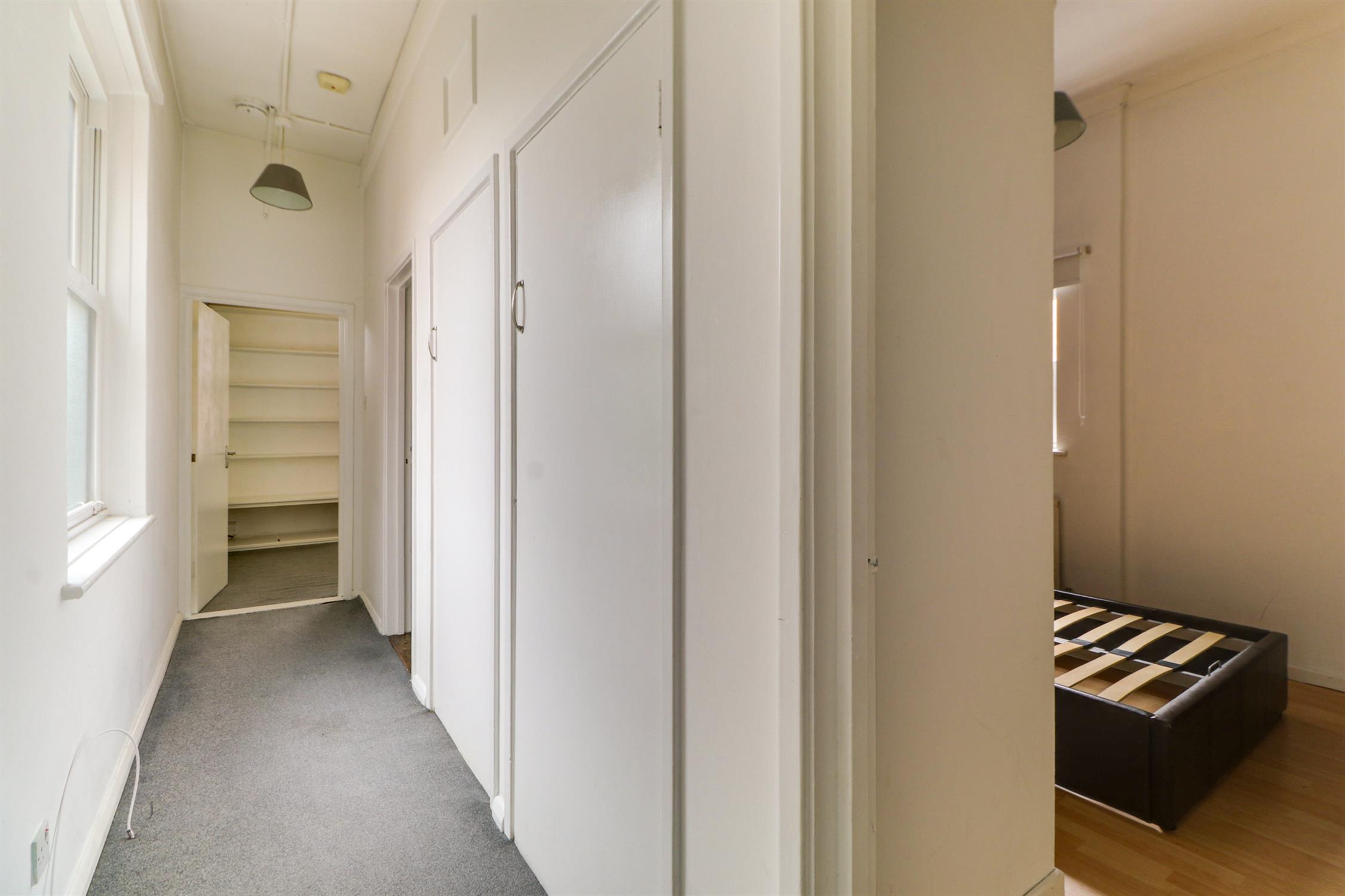 Smooth ceiling, obscured UPVC double-glazed sash window, storage cupboard, airing cupboard, fitted carpet and doors into;