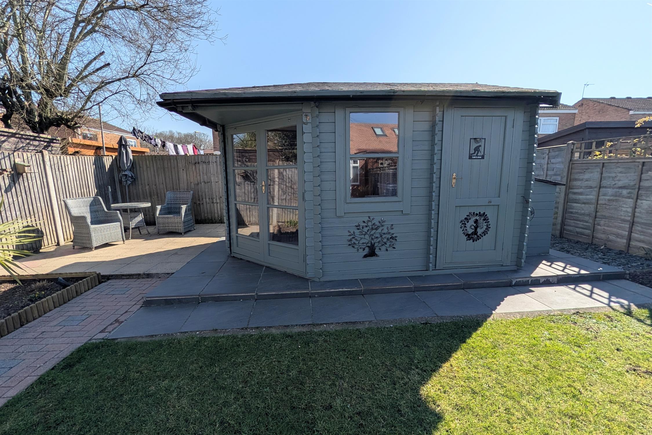 The well-tended rear garden has a patio area adjacent to the property. The majority of the garden can be found mainly laid to lawn. There is a block paved pathway running the length of the garden with a flower bed to one side with a selection of fruit trees. The path leads to a timber summerhouse and a patio to one side. There is also an adjoining store to the summerhouse. The garden is fence enclosed, has an external power socket, an outside water tap, side pedestrian access and further garden store.
