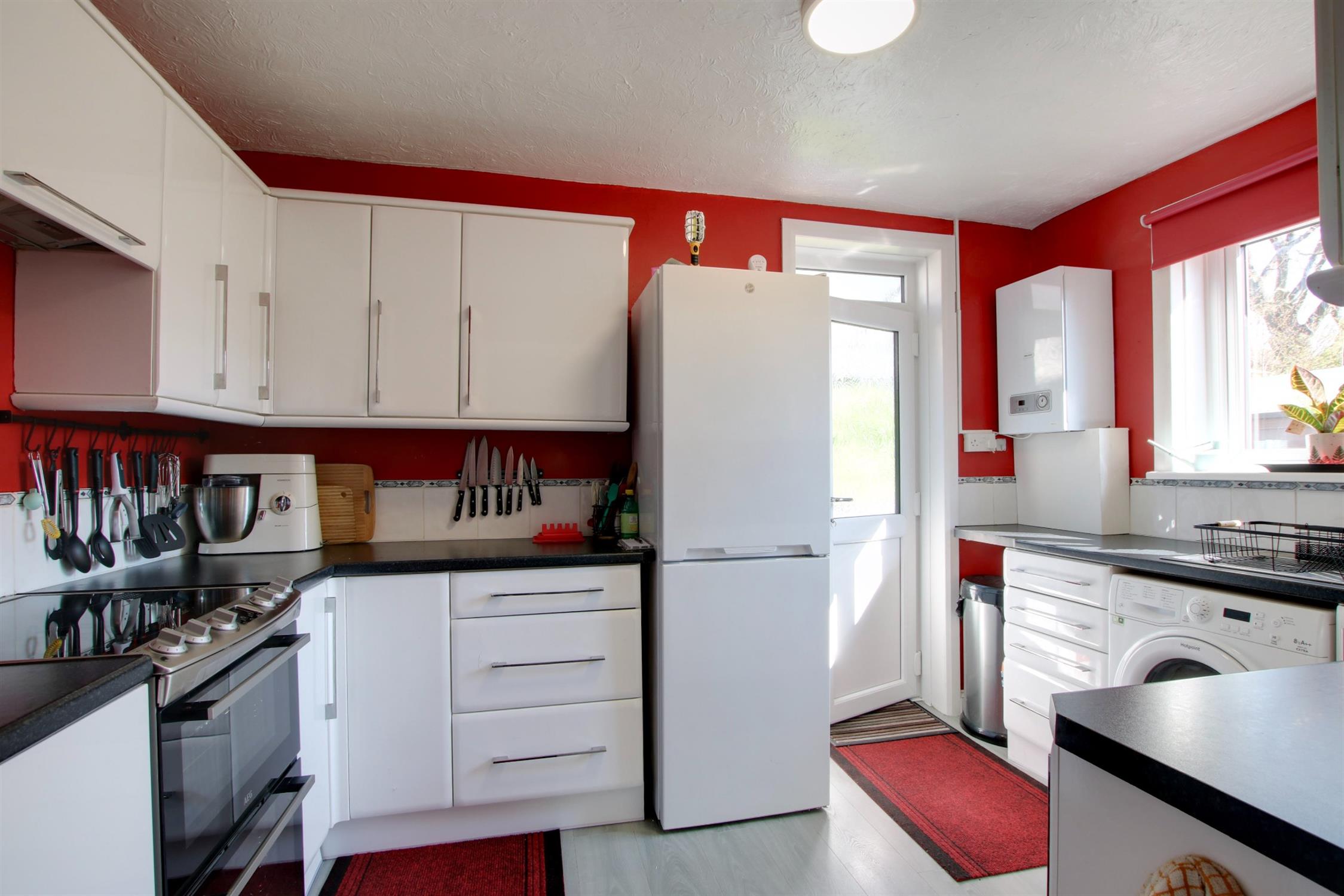 Double glazed window to rear elevation and double glazed door to side. Kitchen comprising stainless steel single drainer sink unit with cupboard under. Further range of wall and base level units with roll edge work surface over and splash back tiling. Recess with electric oven (to remain) with cooker hood over. Plumbing for washing machine and space for fridge/freezer. Wall mounted gas boiler.