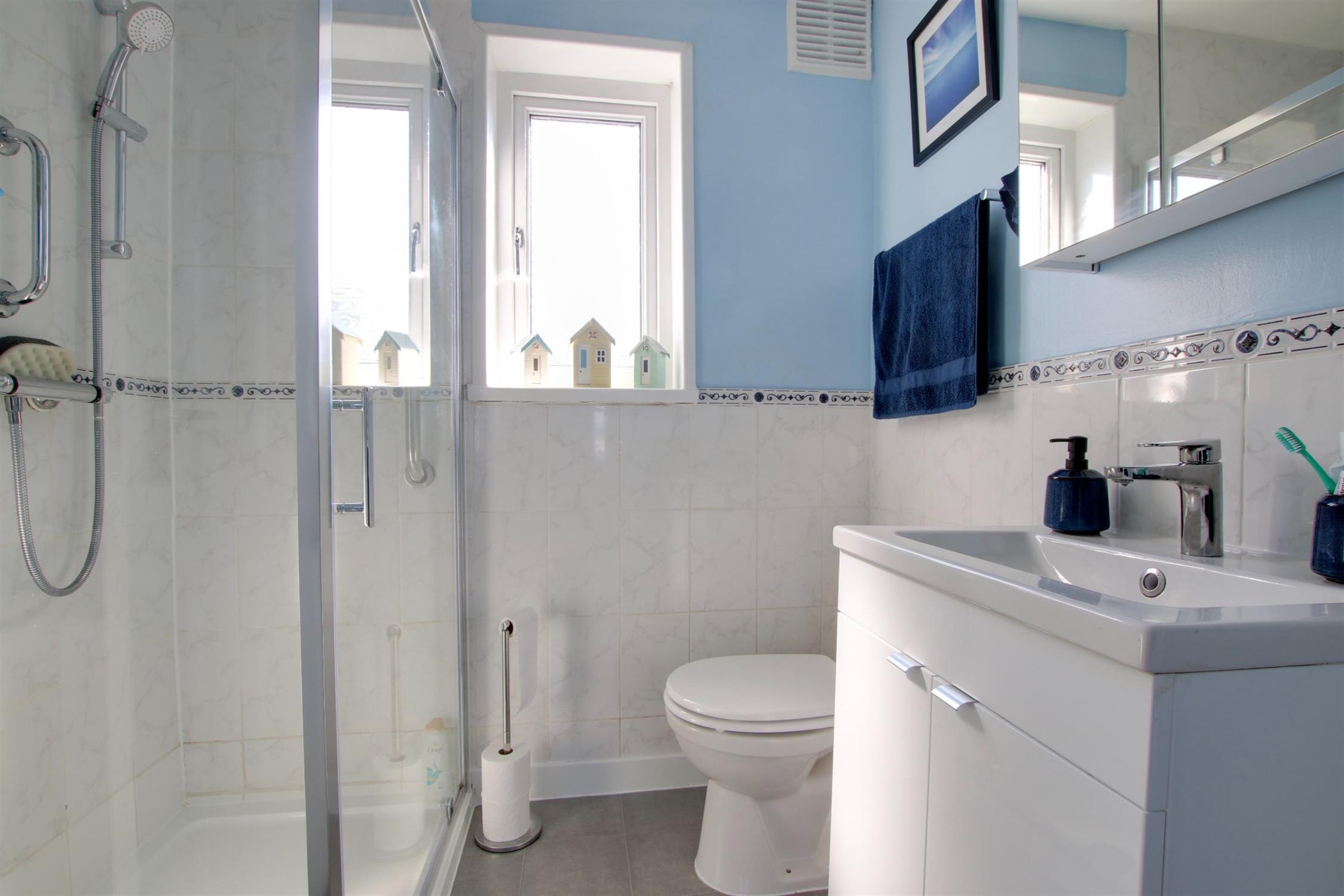 Double glazed window to rear elevation. Low level close coupled WC. Vanity unit with wash hand basin and storage beneath. Heated towel rail.