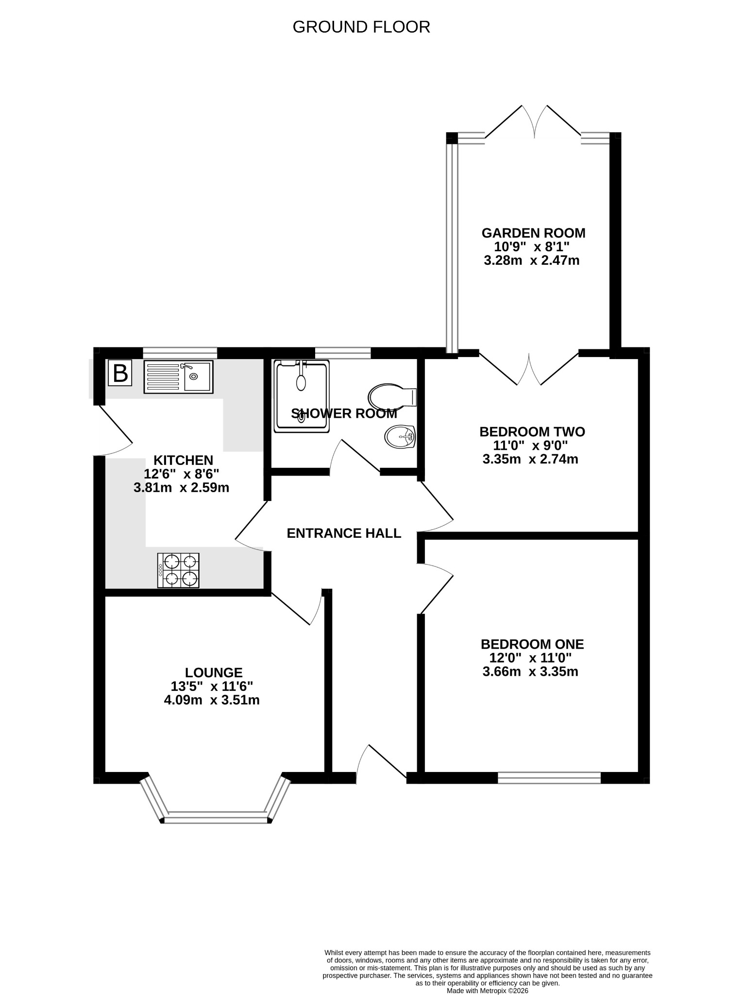 Double glazed windows and French doors leading to garden. Insulated roof. Electric heater. Tiled flooring. Wall lights.