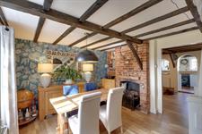Double glazed window overlooking the front garden, stairs to first floor, radiator, wood laminate flooring, a feature exposed brick open fireplace, beamed ceiling and open through to: