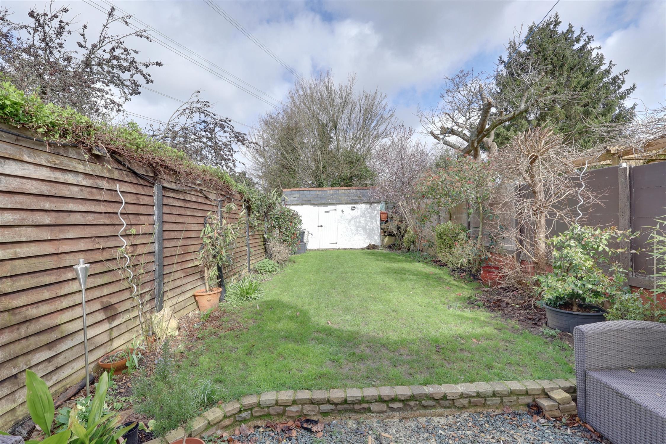 Enclosed with patio area, laid to lawn with a brick-built shed to the rear.