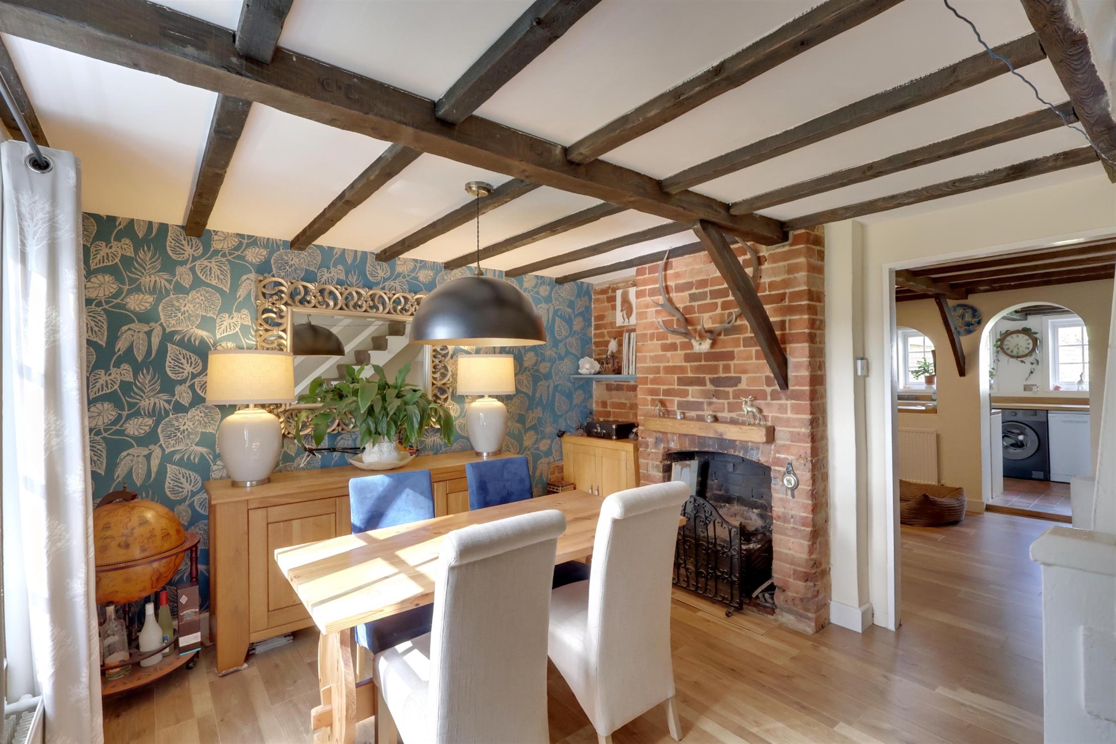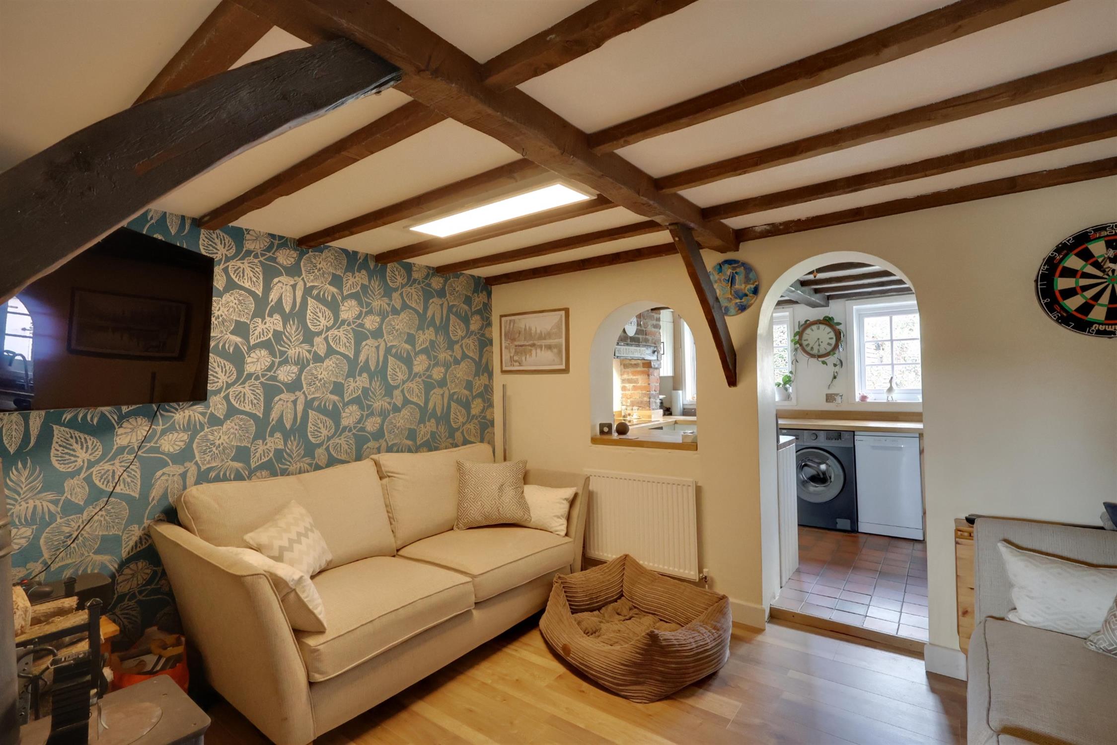 Wood laminate flooring, wood burner and beamed ceiling and open to: