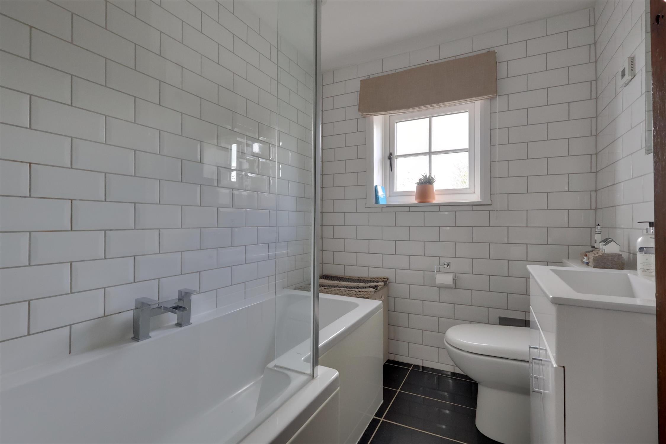A white suite comprising of a panel enclosed bath with a mixer tap and a shower overhead, low flush WC, vanity wash hand basin and a tiled walls, under floor heating, double glazed window and a tiled floor.