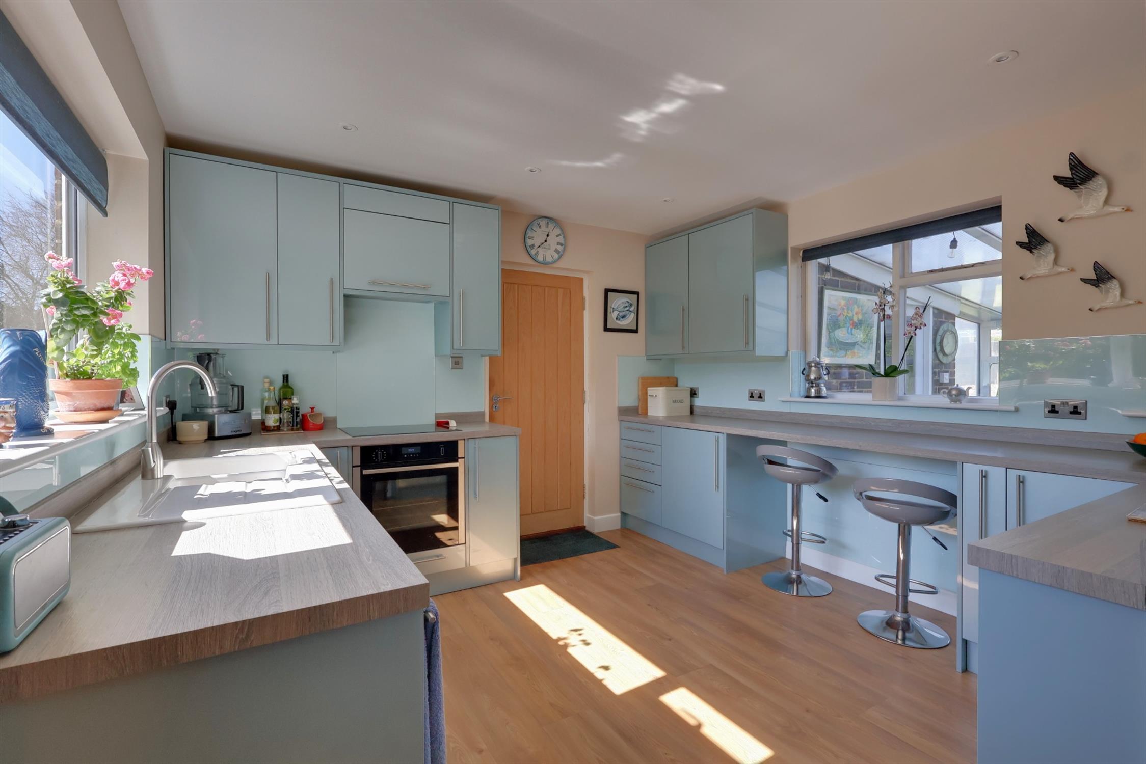 A range of wall and base cupboards with work surface over. Inset one and a half ceramic sink unit with drainer. Four ring induction hob with extractor fan over. Integrated oven, fridge and dishwasher. Breakfast bar. Radiator. Two double glazed windows.