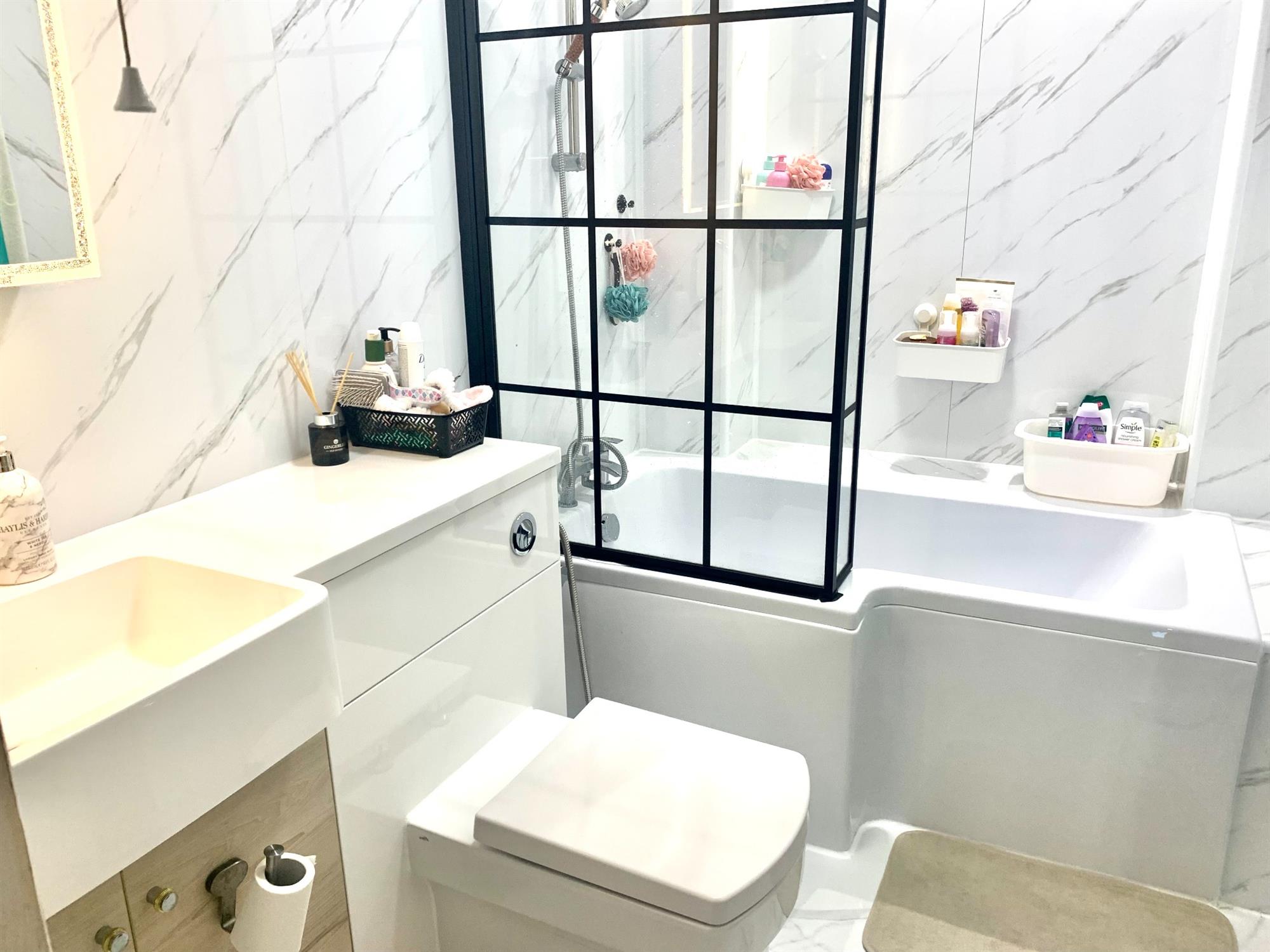 FAMILY BATHROOM - 3 piece white suite with toilet, sink with vanity and bath with shower over.