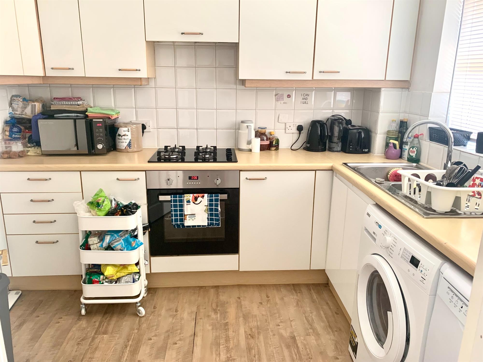 KITCHEN – Good size kitchen with various wall and base units with window to front. Appliances consist of gas hob, electric oven, dishwasher and washing machine.