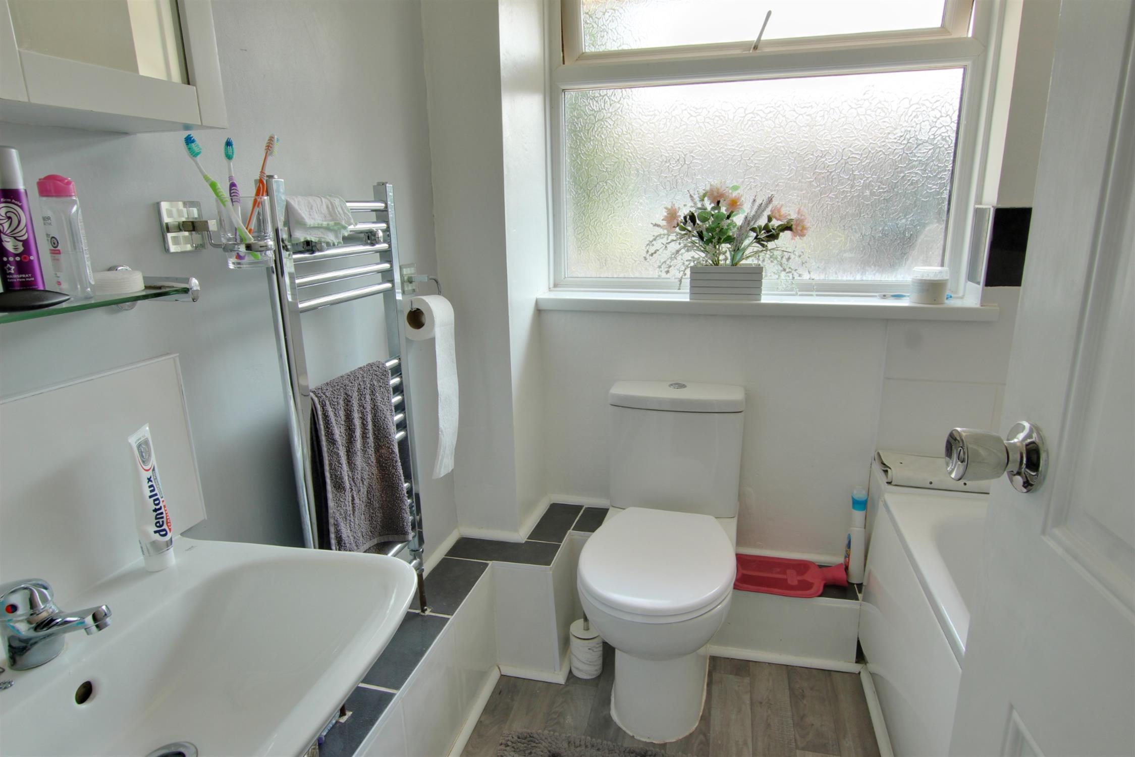 Window to rear. Panelled bath with shower over. Low level WC. Wash hand basin. Complementary tiling. Heated towel radiator.