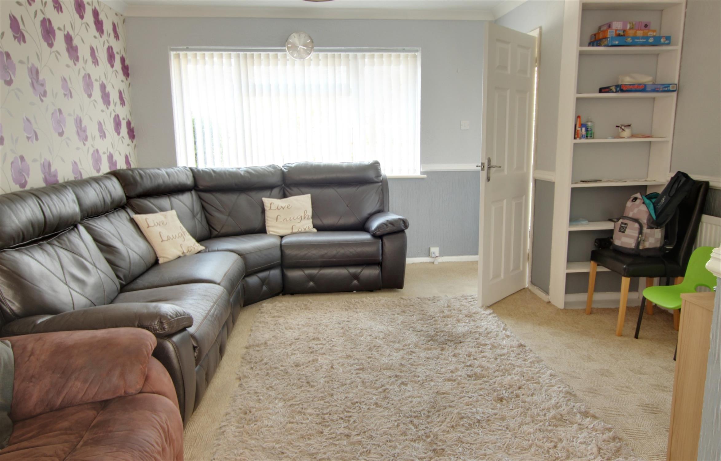 The front garden is laid to lawn. Path to front entrance.