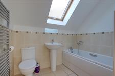 Skylight to the rear aspect. Smooth and coved ceiling with extractor fan. Suite comprising bath with hand shower, wash hand basin and low level WC. Electric heated towel rail. Part tiled walls. Tiled flooring.