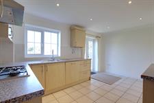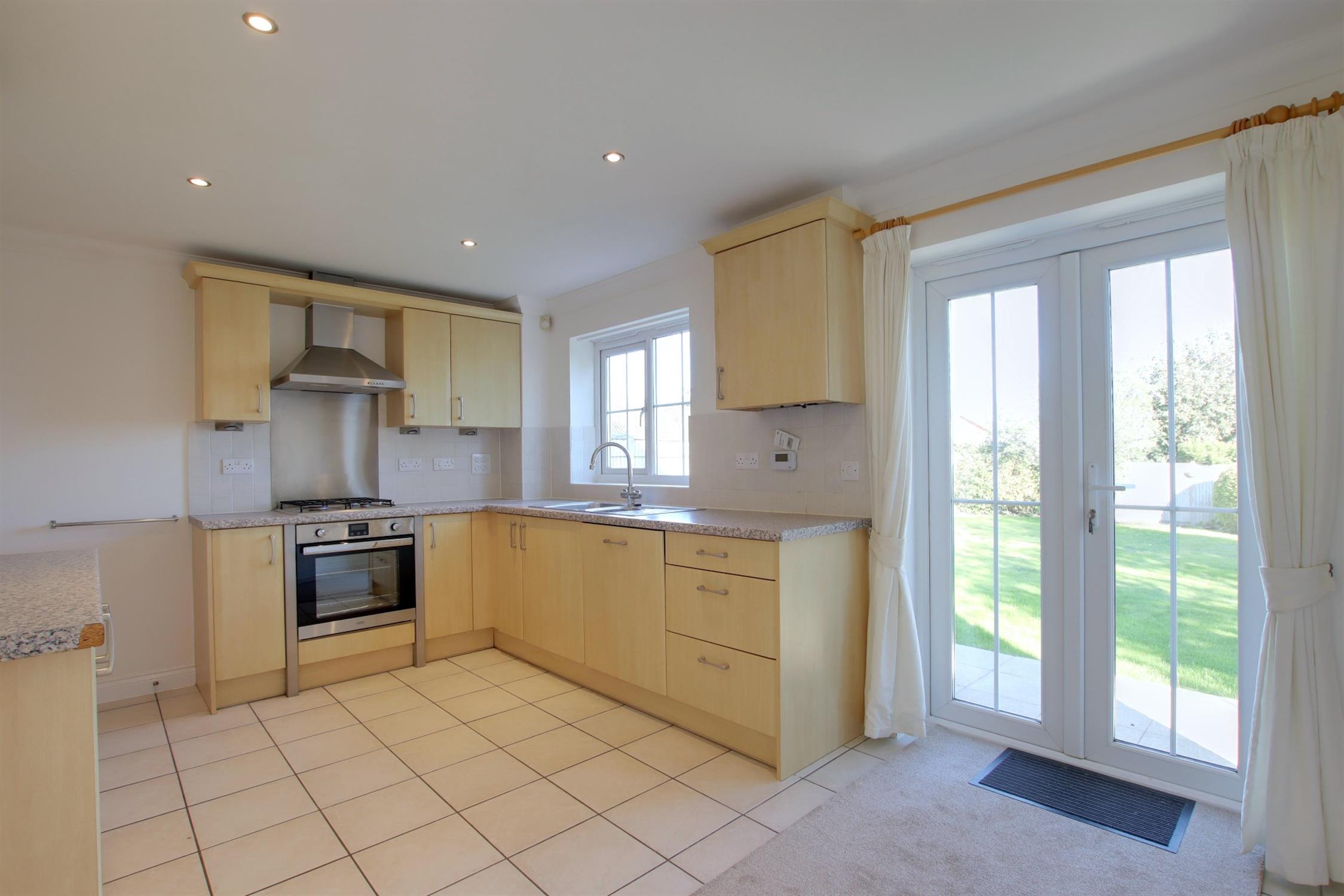 Double glazed French doors to the rear garden. Smooth and coved ceiling with inset spotlighting. Matching wall and base units with contrasting work tops. Inset stainless steel sink and half drainer. Tiled splashback. Four ring gas hob with extractor above. Space for fridge/freezer. Integrated oven/grill and dishwasher. Tiled flooring.