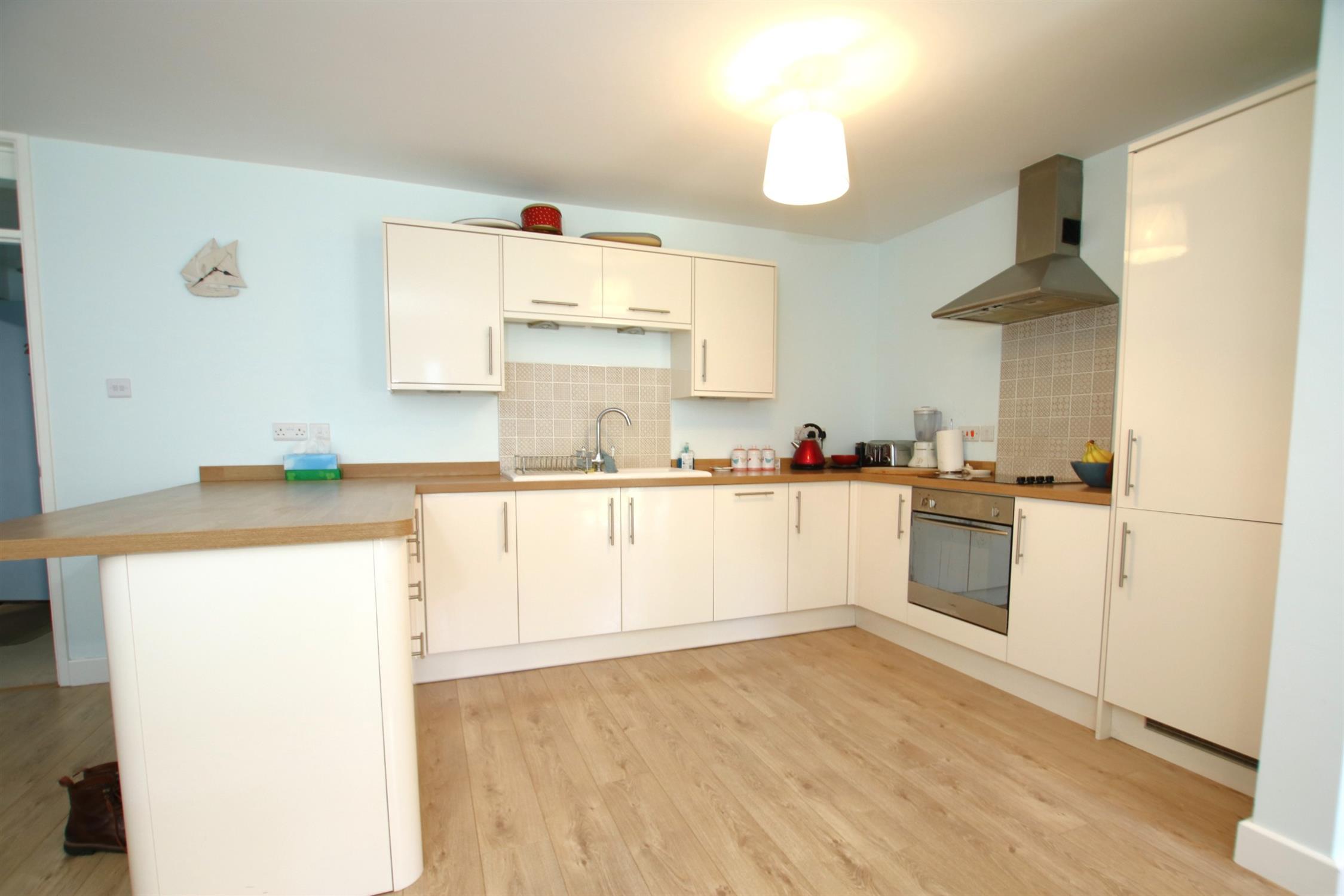 Excellent open plan space. South facing so gets a lot of natural light. Ample space for living and dining room furniture. Kitchen has a peninsula island/breakfast bar, sink and drainer, hob, oven and integrated fridge freezer.