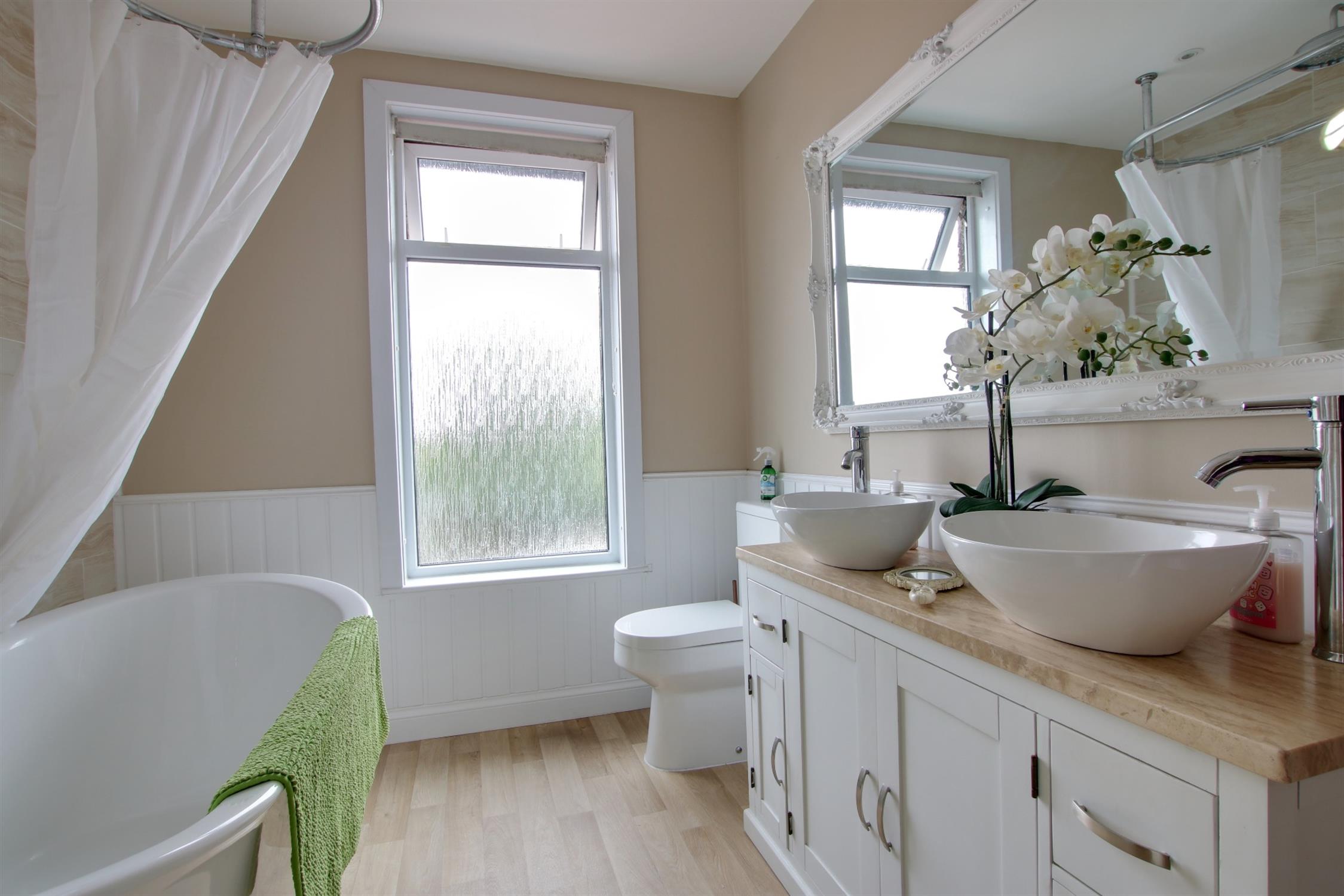 Refitted bathroom with double glazed window to rear elevation. Vanity unit with twin ceramic bowls set onto a marble top with storage units beneath. Freestanding double ended bath with central mixer taps and shower attachment over with monsoon shower head. Low level close coupled WC. Column radiator with towel rail. Tiled walls. Inset ceiling spotlights.