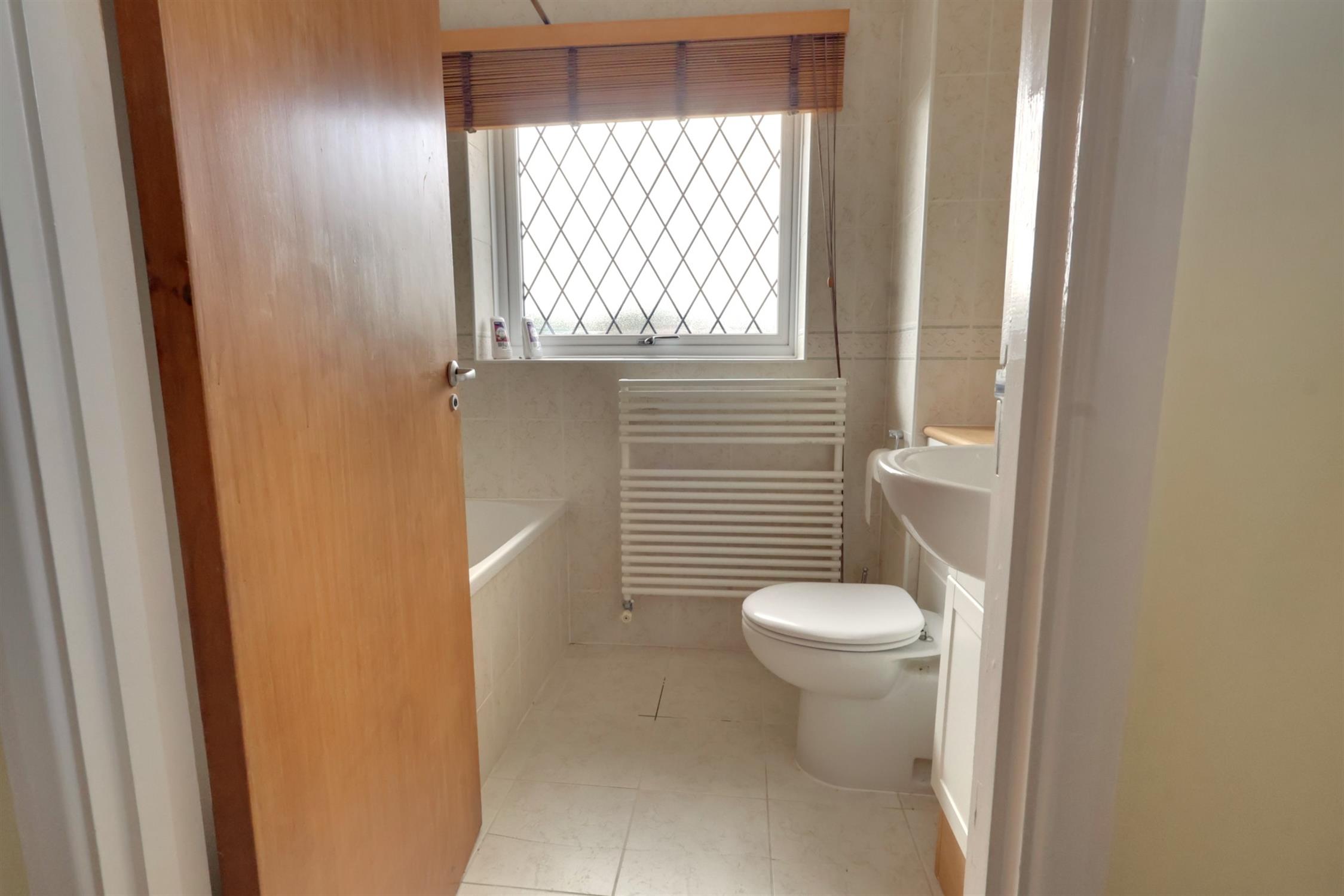 Upvc double glazed and obscured window, sink with tiled splashback and storage cupboard under, toilet, radiator.