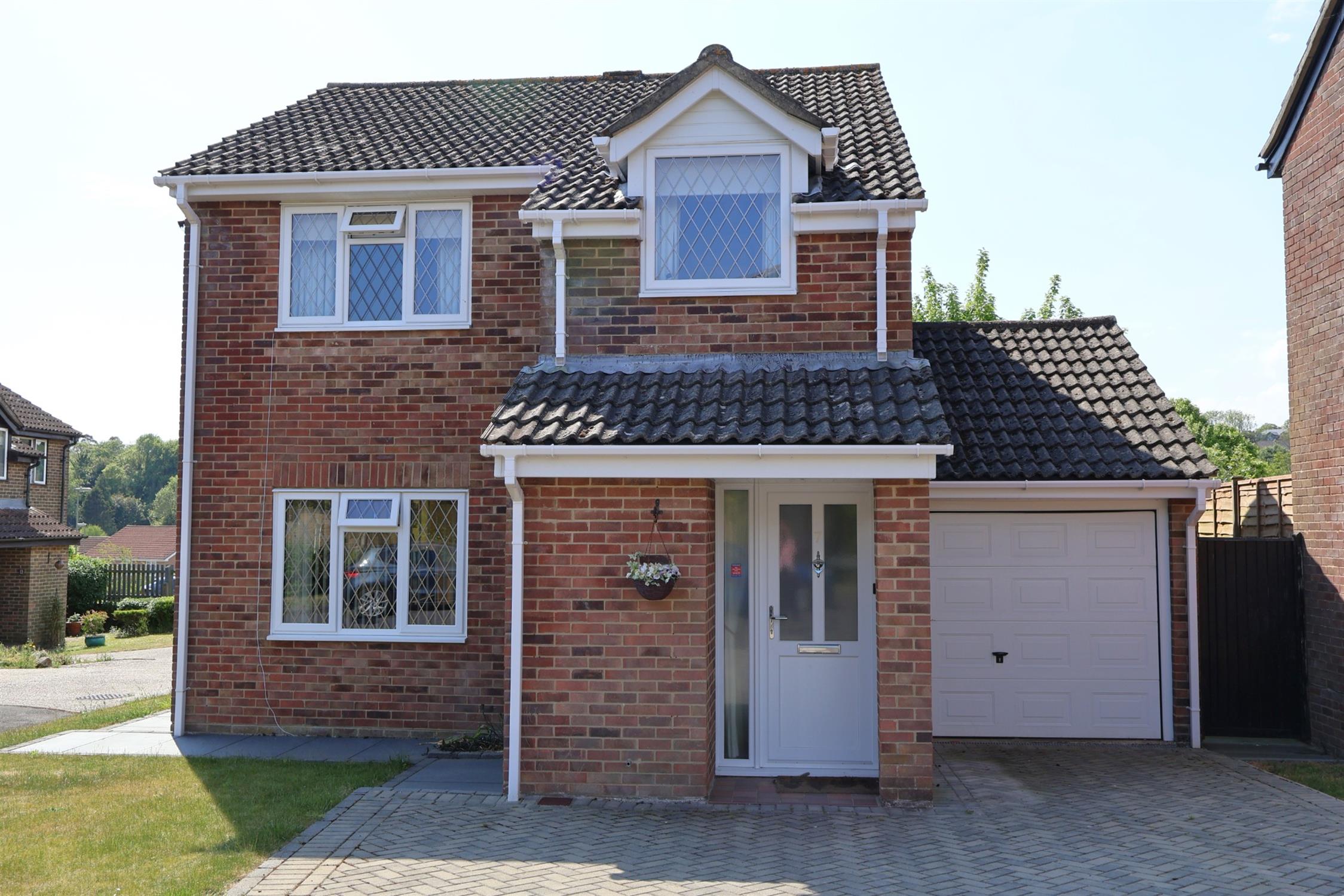 The front offers parking for several vehicles, access to the garage and a side path to the garden gate.